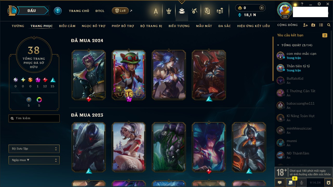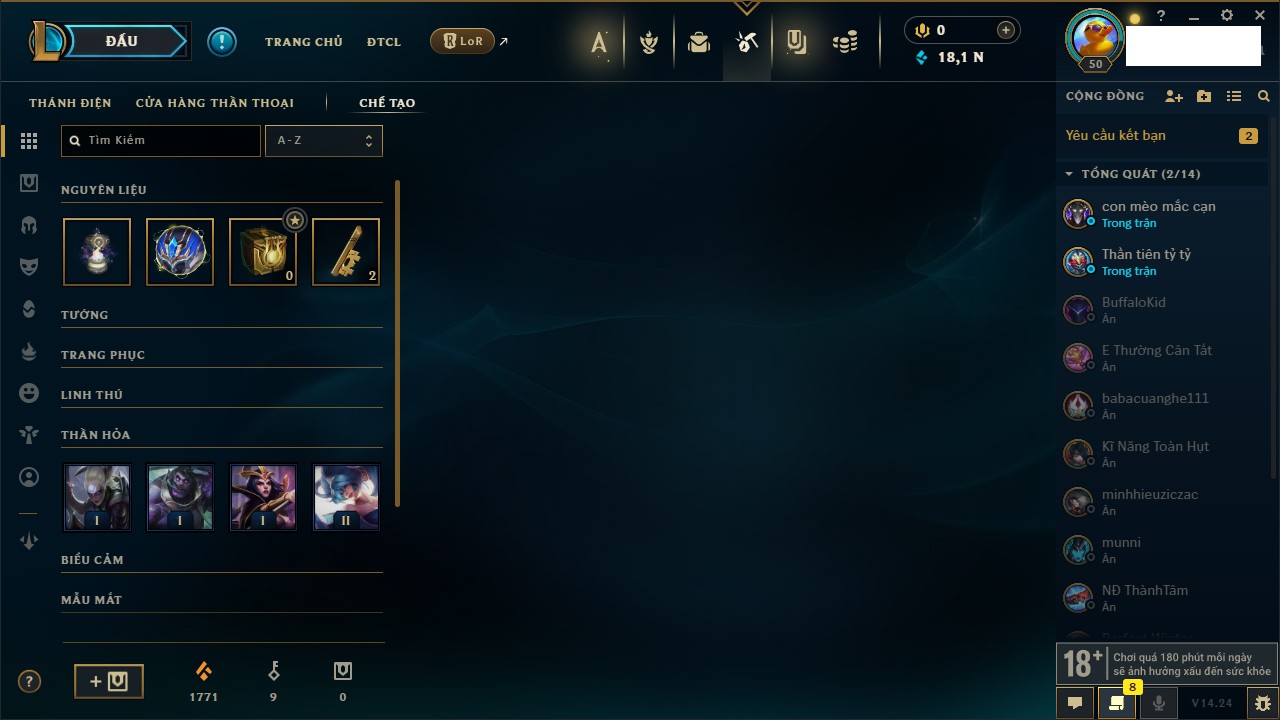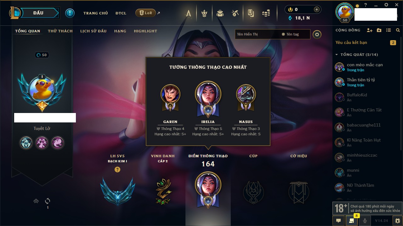 Rank Đơn: Sắt IIIKhung: Chưa có khungTướng: 77 - Còn 8133 THXTrang Phục: 11Rank ĐTCL: Bạch Kim IVLinh Thú: 108