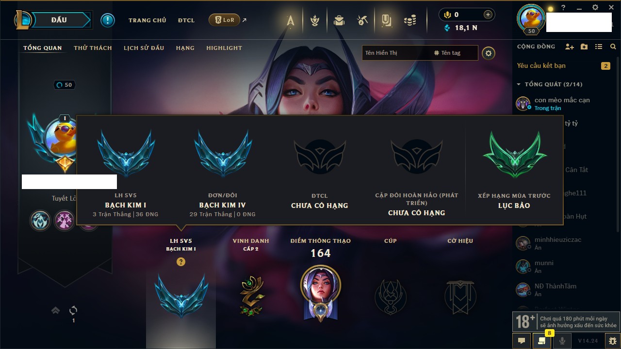 Rank Đơn: Bạc IVKhung: BạcTướng: 76 - Còn 1316 THXTrang Phục: 14Rank ĐTCL: Vàng IILinh Thú: 96