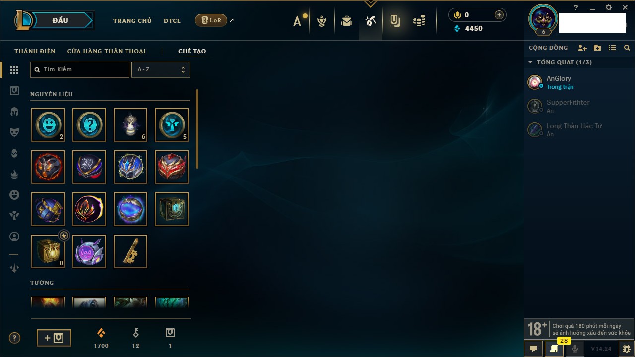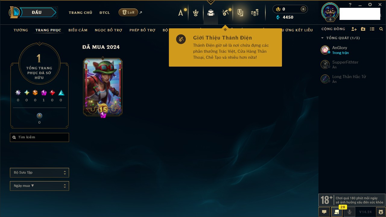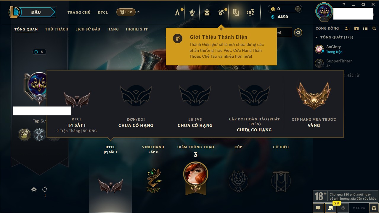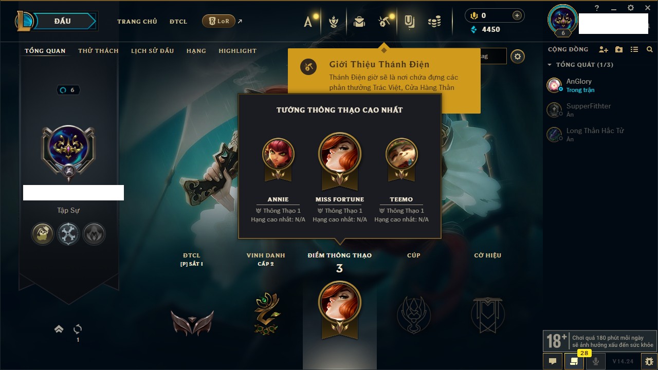 Rank Đơn: Chưa rank mùa nàoKhung: Chưa có khungTướng: 19 - Còn 1155 THXTrang Phục: 2Rank ĐTCL: Chưa RankLinh Thú: 20