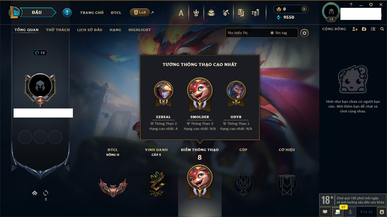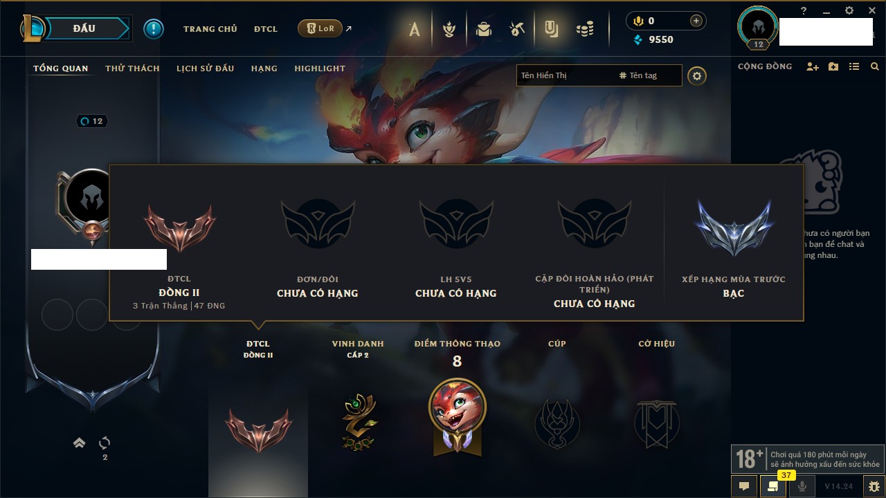 Rank Đơn: Chưa rank mùa nàoKhung: Chưa có khungTướng: 15 - Còn 3080 THXTrang Phục: 2Rank ĐTCL: Chưa RankLinh Thú: 40