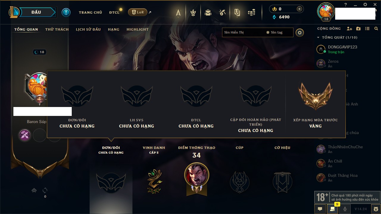 Rank Đơn: Chưa rank mùa nàoKhung: Chưa có khungTướng: 28 - Còn 5900 THXTrang Phục: 0Rank ĐTCL: Chưa RankLinh Thú: 2