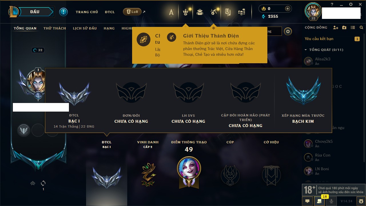 Rank Đơn: Chưa rank mùa nàoKhung: Chưa có khungTướng: 16 - Còn 9050 THXTrang Phục: 1Rank ĐTCL: Chưa RankLinh Thú: 14