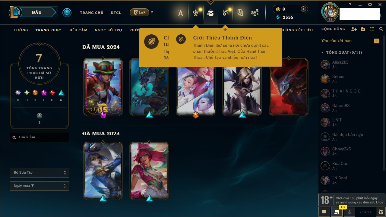 Rank Đơn: Chưa rank mùa nàoKhung: Chưa có khungTướng: 158 - Còn 7570 THXTrang Phục: 5Rank ĐTCL: Chưa RankLinh Thú: 45