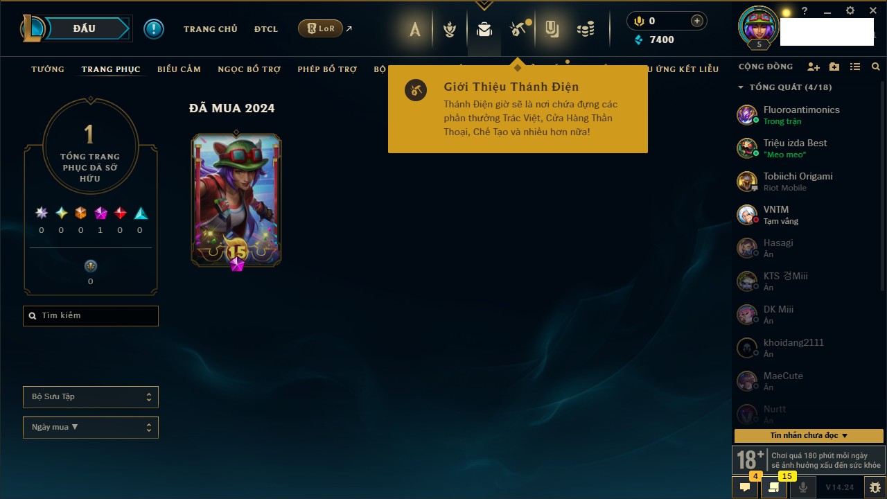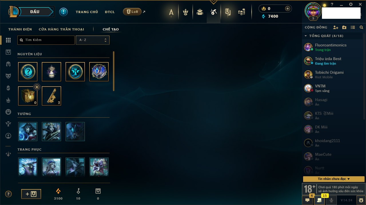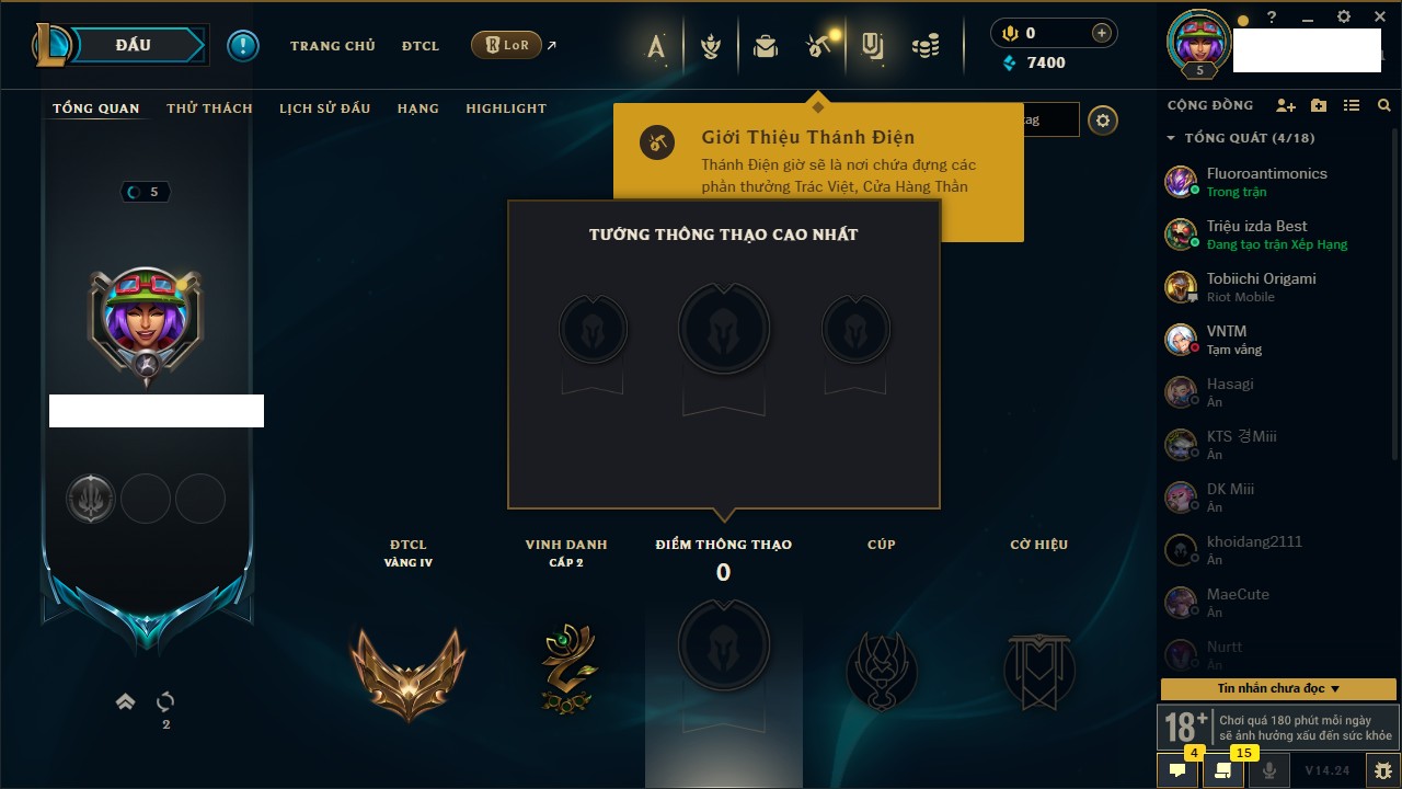 Rank Đơn: Chưa rank mùa nàoKhung: Chưa có khungTướng: 0 - Còn 4000 THXTrang Phục: 0Rank ĐTCL: Đồng ILinh Thú: 18