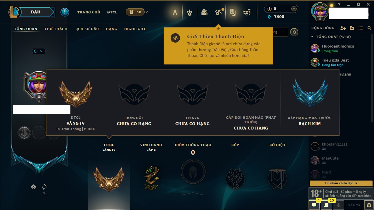 Rank Đơn: Chưa rank mùa nàoKhung: Chưa có khungTướng: 7 - Còn 24800 THXTrang Phục: 0Rank ĐTCL: Bạch Kim IVLinh Thú: 19