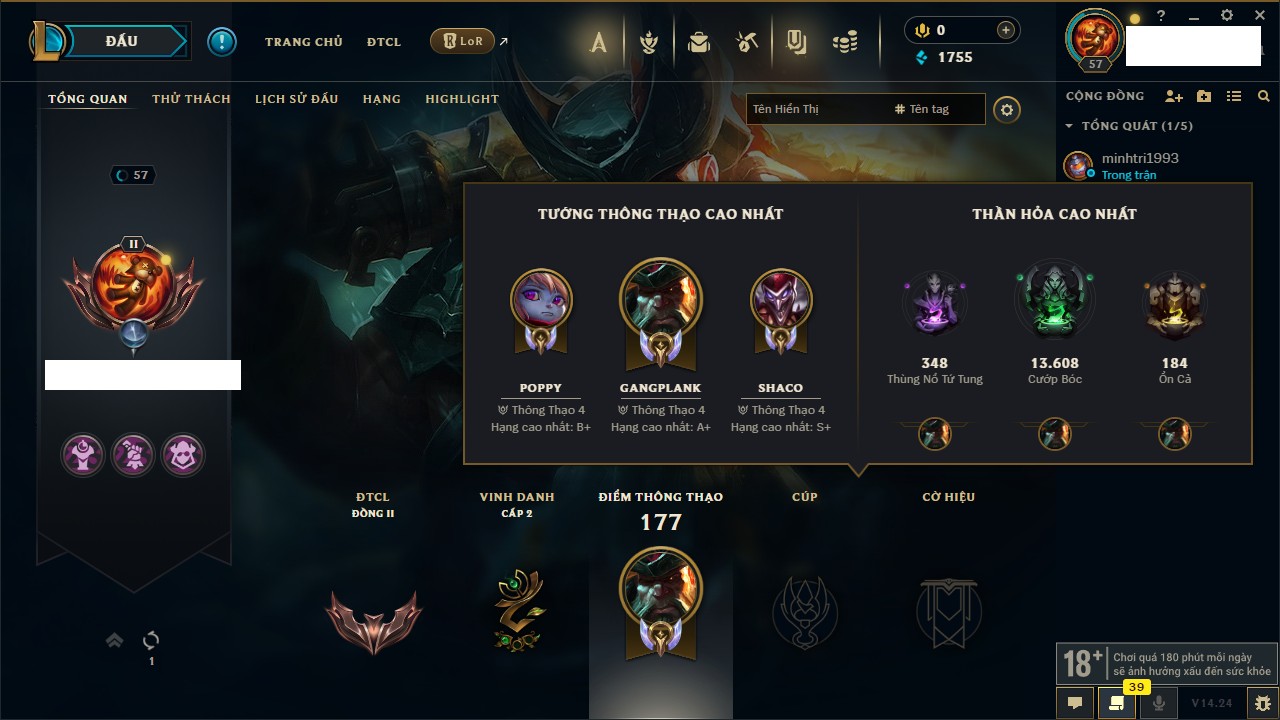 Rank Đơn: Chưa rank mùa nàoKhung: Chưa có khungTướng: 20 - Còn 2091 THXTrang Phục: 1Rank ĐTCL: Chưa RankLinh Thú: 4