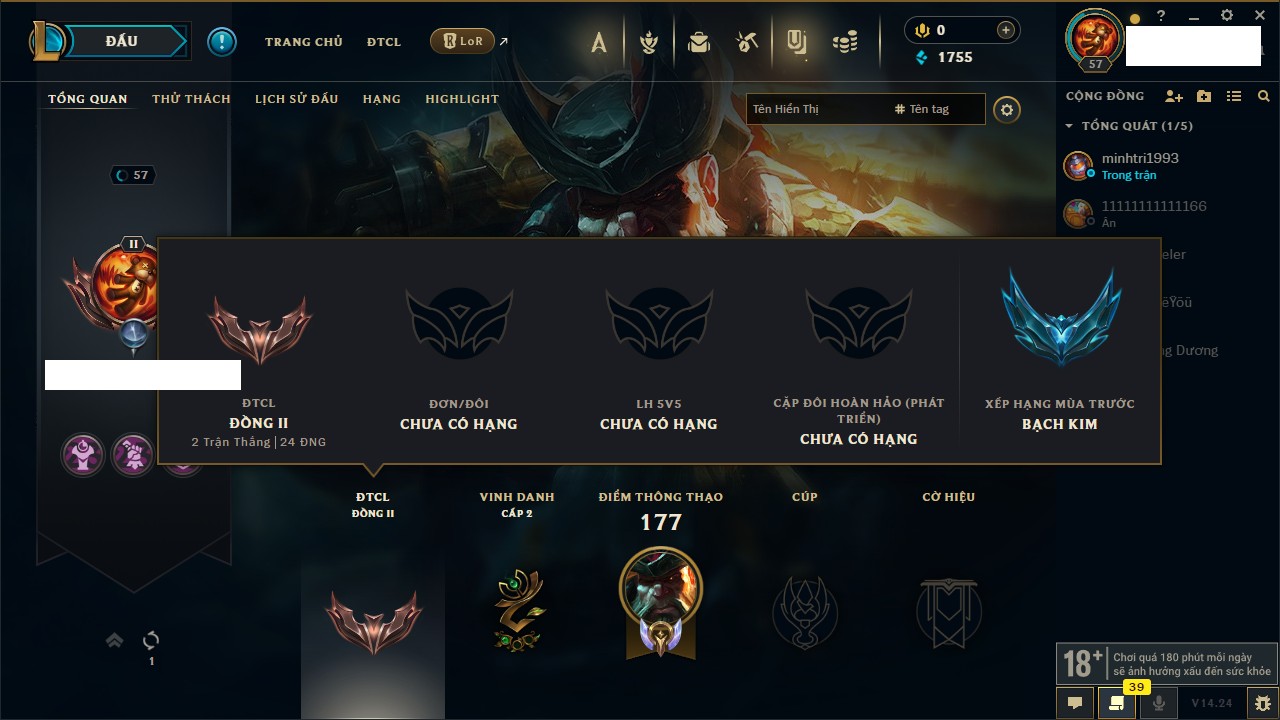 Rank Đơn: Chưa rank mùa nàoKhung: Chưa có khungTướng: 25 - Còn 3980 THXTrang Phục: 0Rank ĐTCL: Chưa RankLinh Thú: 25