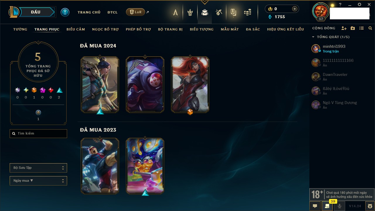 Rank Đơn: Chưa rank mùa nàoKhung: Chưa có khungTướng: 21 - Còn 1585 THXTrang Phục: 1Rank ĐTCL: Chưa RankLinh Thú: 2