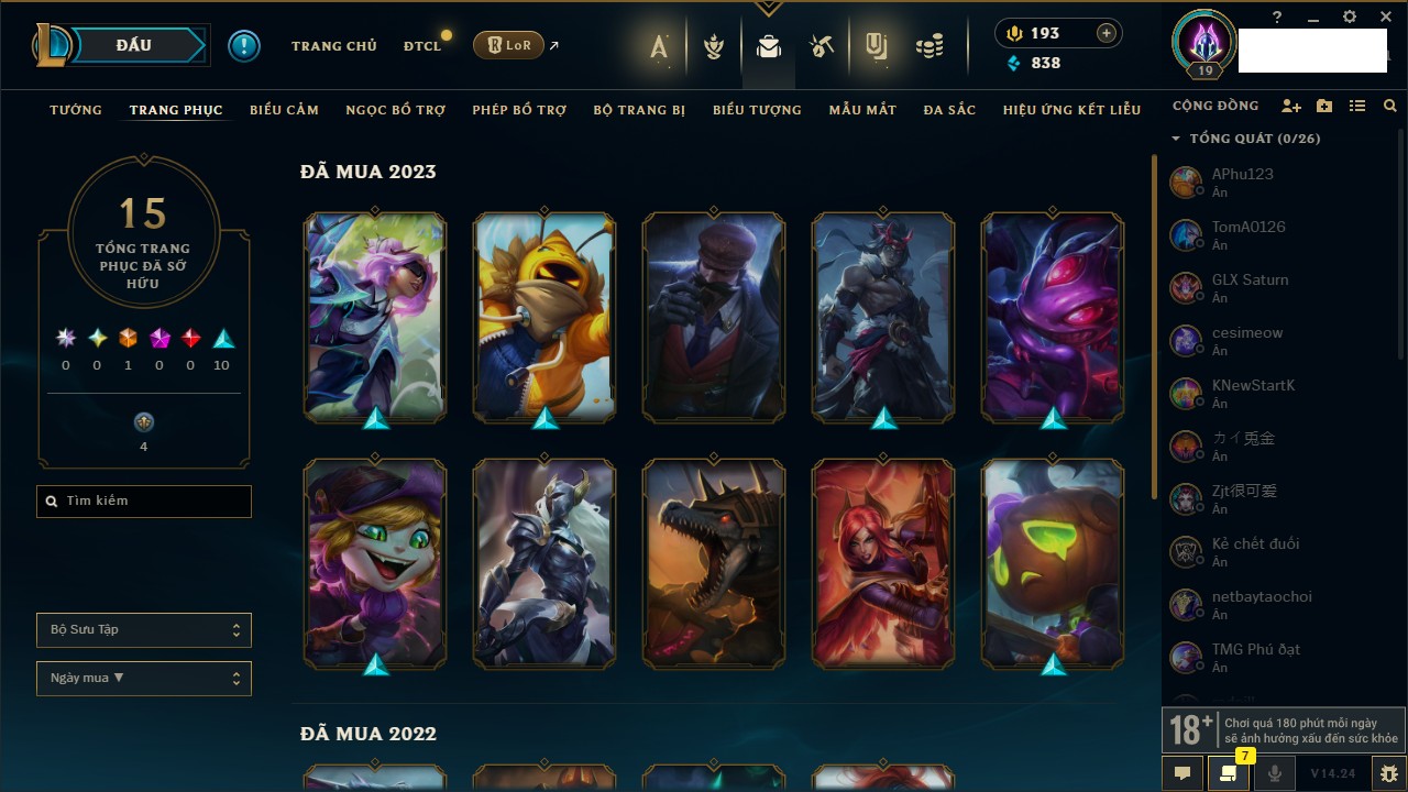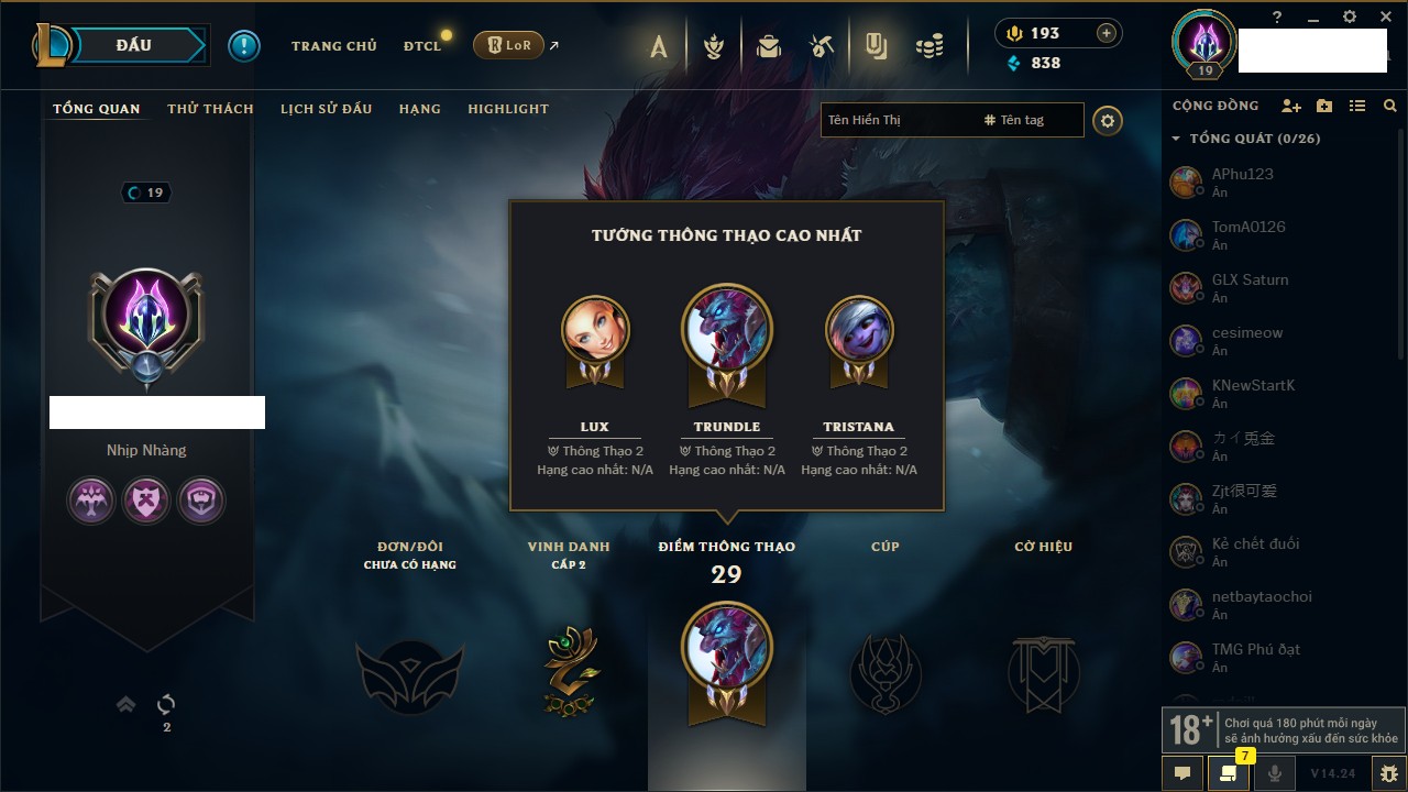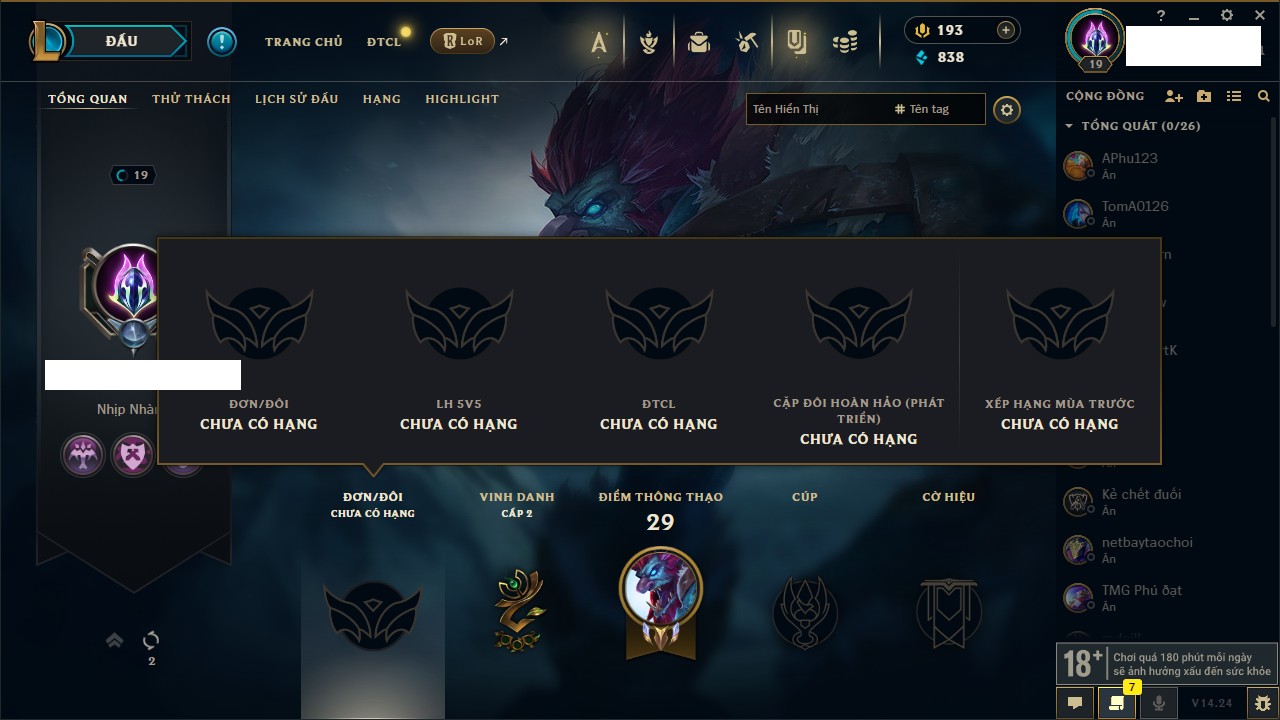 Rank Đơn: Chưa rank mùa nàoKhung: Chưa có khungTướng: 0 - Còn 14550 THXTrang Phục: 0Rank ĐTCL: Chưa RankLinh Thú: 50