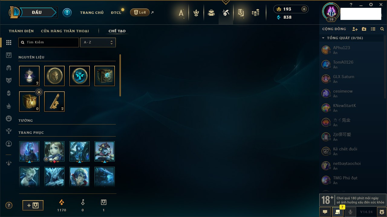 Rank Đơn: Chưa rank mùa nàoKhung: Chưa có khungTướng: 170 - Còn 27116 THXTrang Phục: 42Rank ĐTCL: Chưa rank mùa nàoLinh Thú: 118