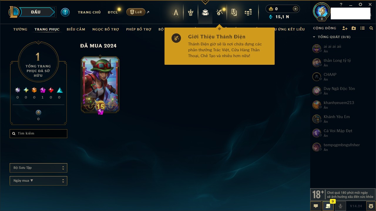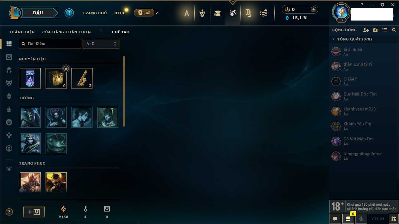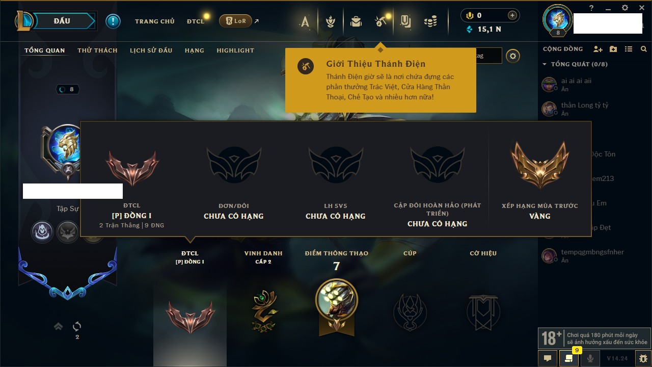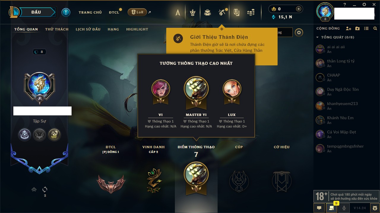 Rank Đơn: Vàng IIIKhung: BạcTướng: 171 - Còn 101359 THXTrang Phục: 88Rank ĐTCL: Kim Cương IVLinh Thú: 200