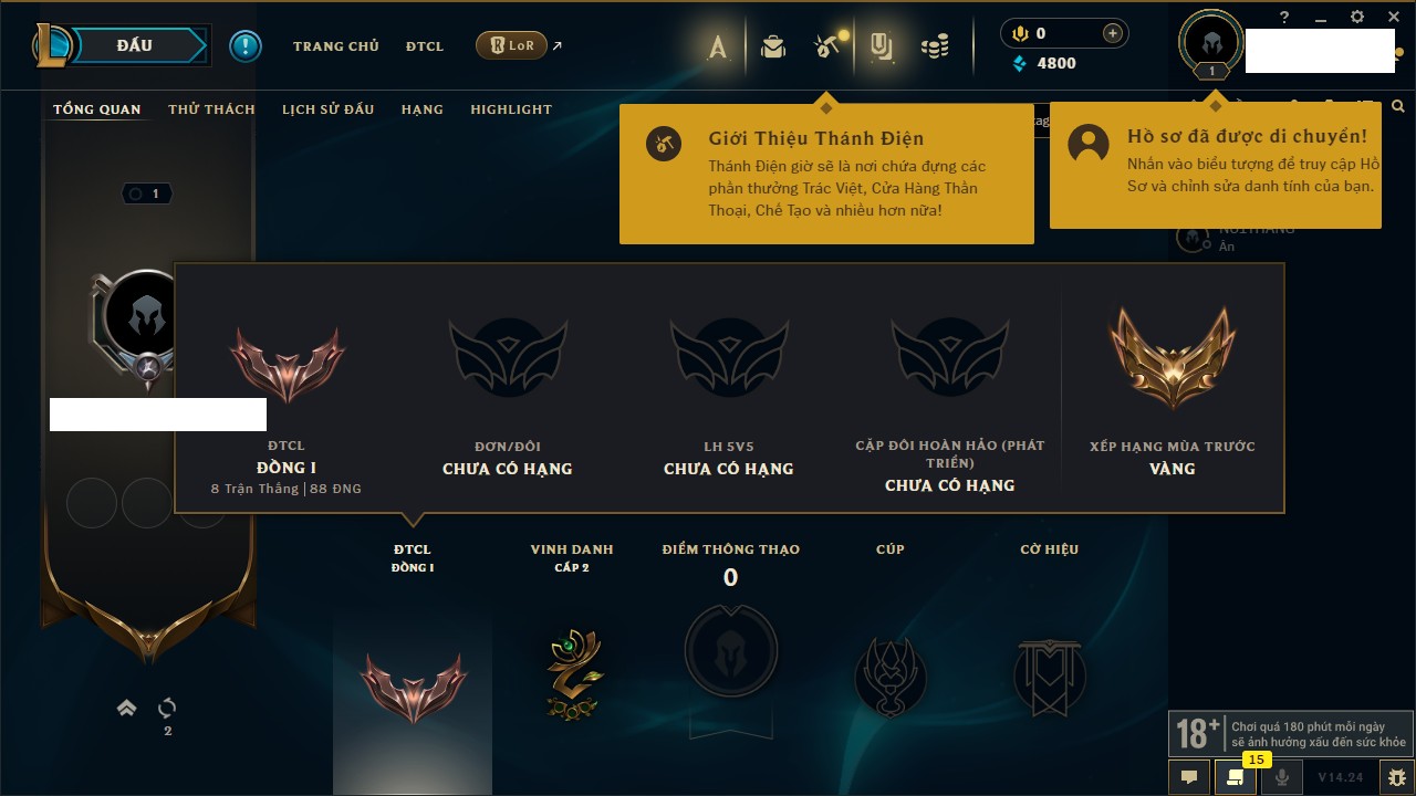 Rank Đơn: Vàng IIIKhung: BạcTướng: 171 - Còn 101359 THXTrang Phục: 88Rank ĐTCL: Kim Cương IVLinh Thú: 200