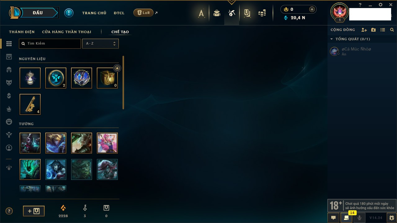 Rank Đơn: Chưa rank mùa nàoKhung: Chưa có khungTướng: 2 - Còn 9000 THXTrang Phục: 0Rank ĐTCL: Bạch Kim IIILinh Thú: 31