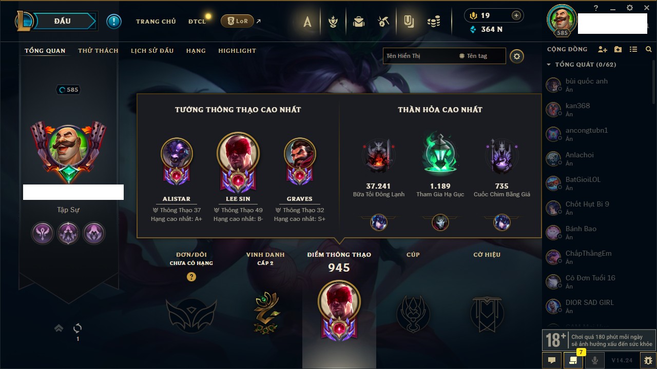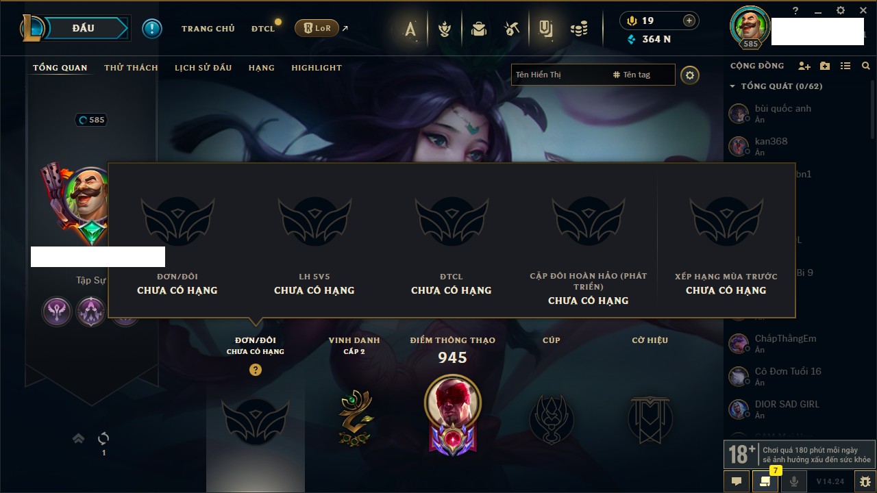 Rank Đơn: Đồng IIKhung: ĐồngTướng: 170 - Còn 66145 THXTrang Phục: 215Rank ĐTCL: Chưa RankLinh Thú: 52