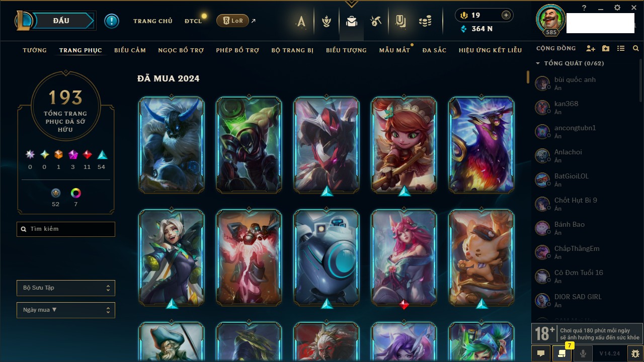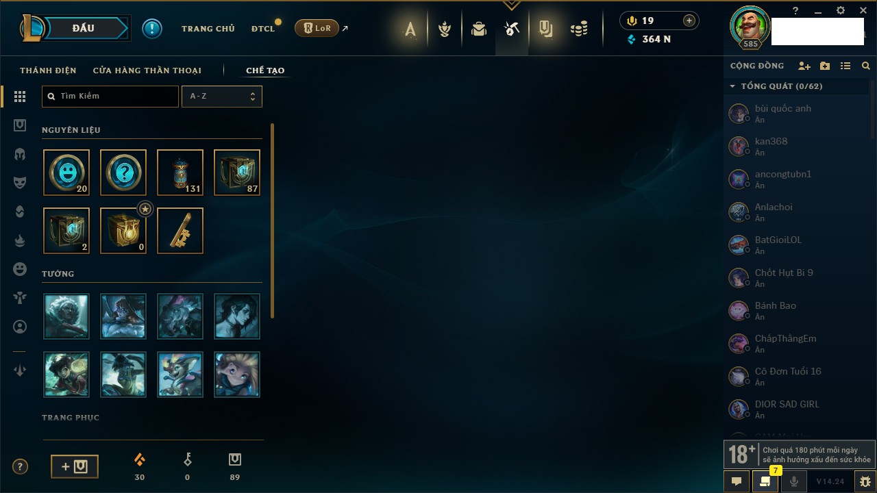 Rank Đơn: Vàng IIIKhung: BạcTướng: 171 - Còn 101359 THXTrang Phục: 88Rank ĐTCL: Kim Cương IVLinh Thú: 200