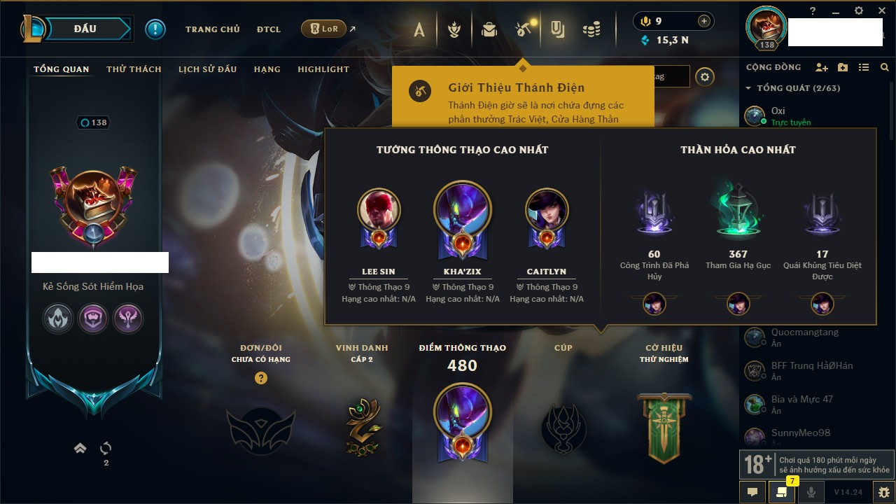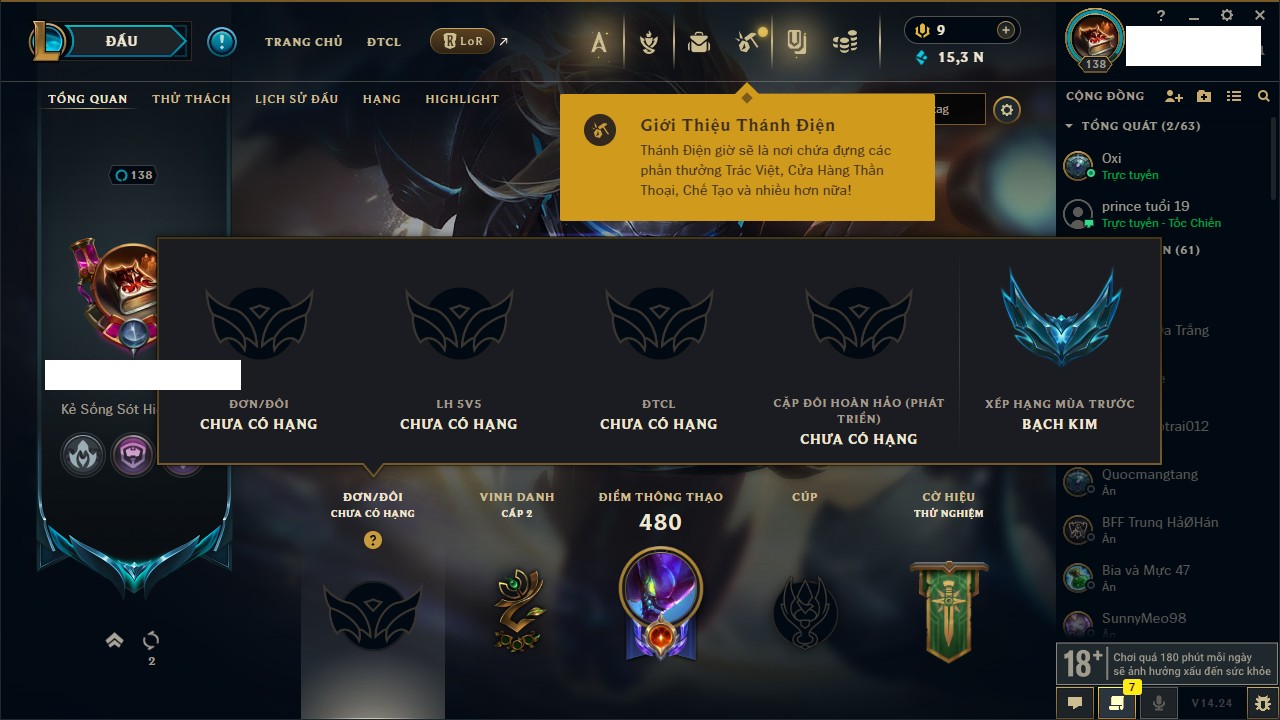 Rank Đơn: Vàng IIKhung: Bạch kimTướng: 172 - Còn 123420 THXTrang Phục: 231Rank ĐTCL: Bạch Kim IVLinh Thú: 213