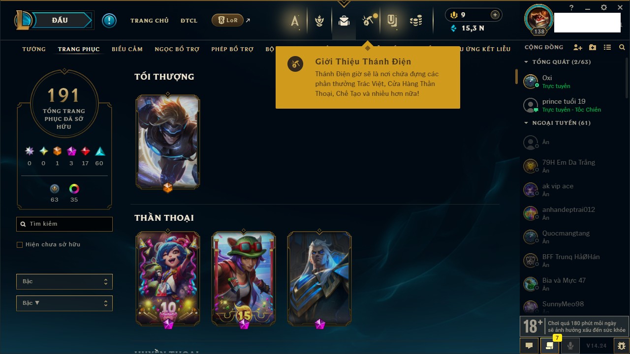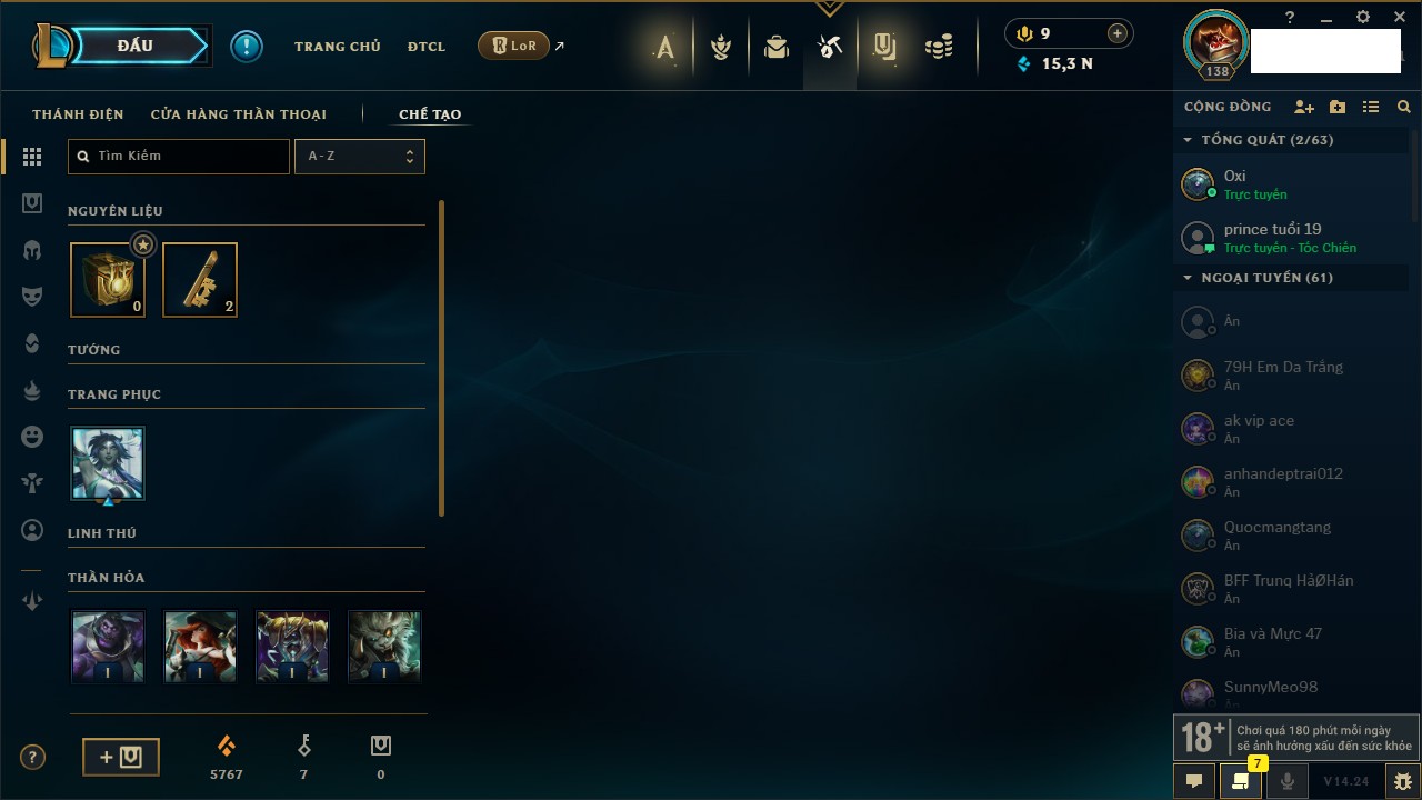 Rank Đơn: Vàng IIIKhung: VàngTướng: 172 - Còn 200315 THXTrang Phục: 87Rank ĐTCL: Chưa RankLinh Thú: 136