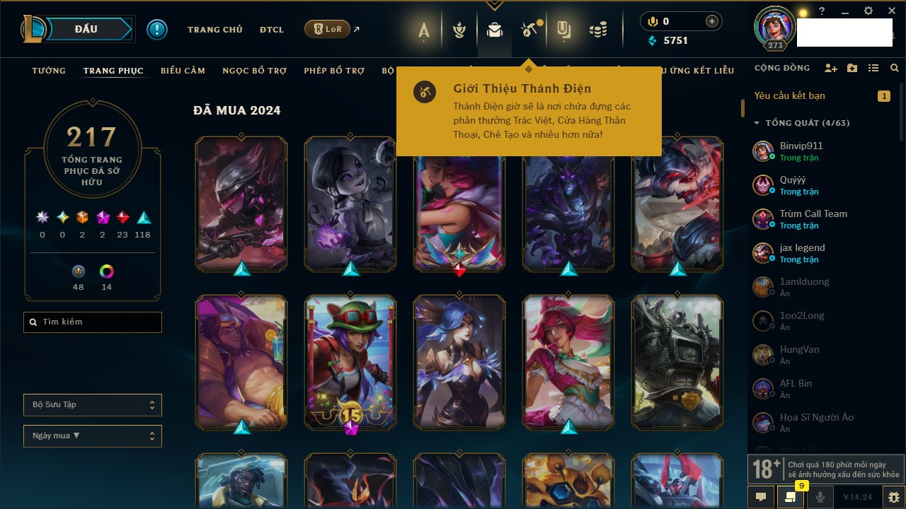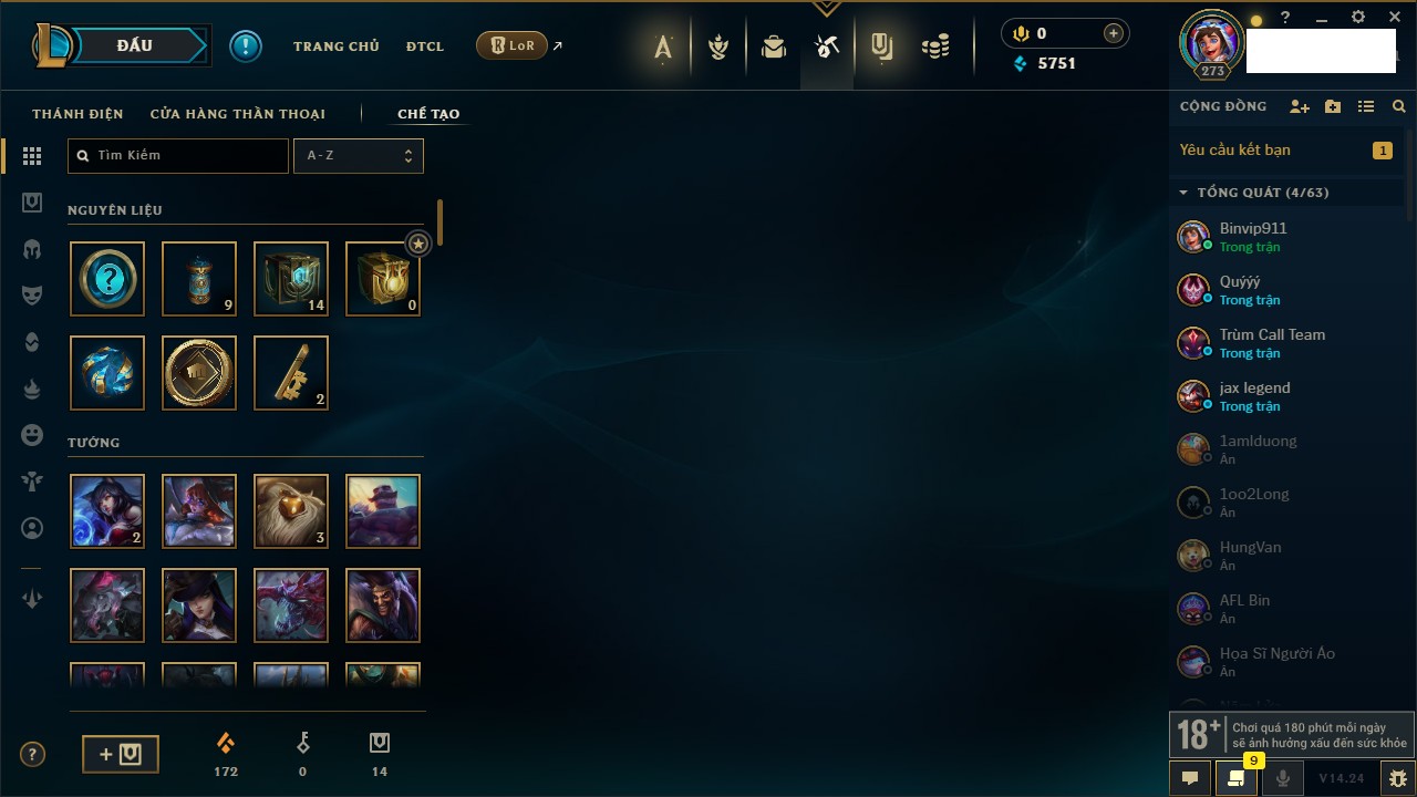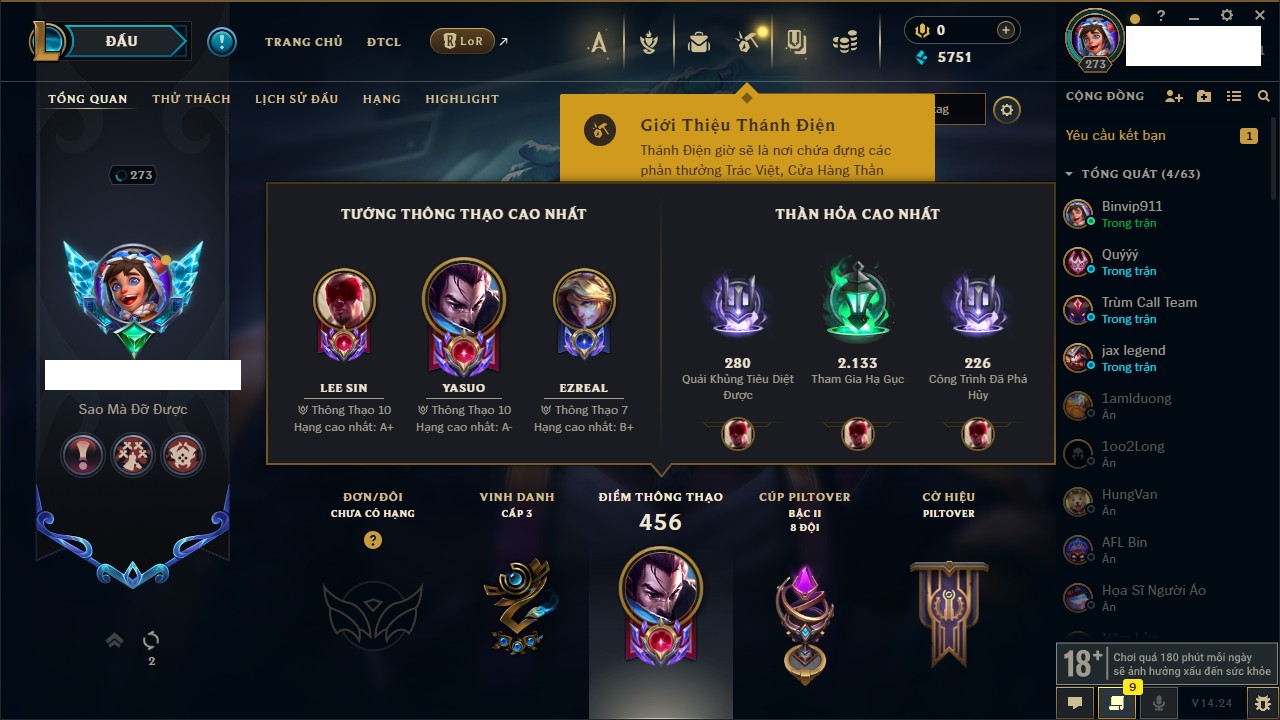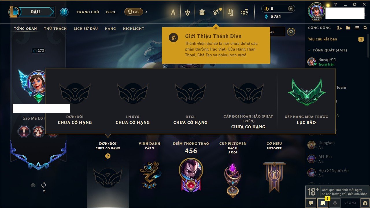 Rank Đơn: Bạc IIIKhung: BạcTướng: 171 - Còn 51045 THXTrang Phục: 220Rank ĐTCL: Sắt IILinh Thú: 141
