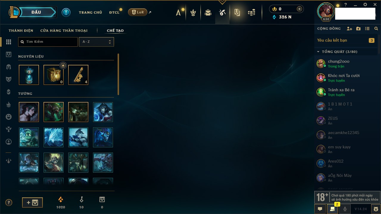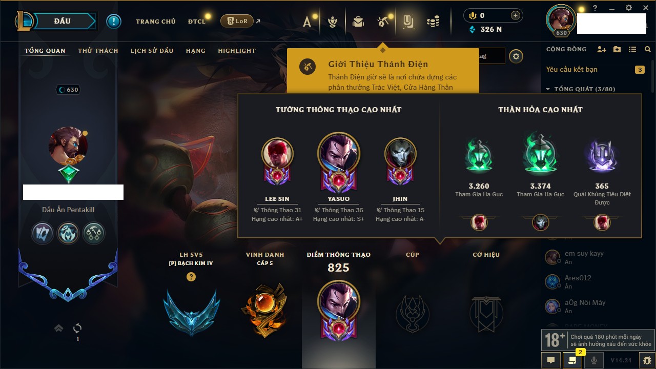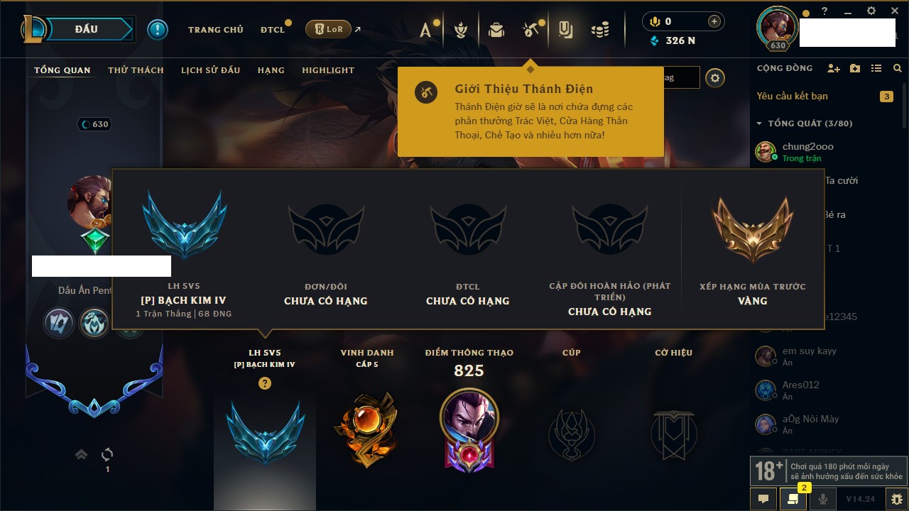 Rank Đơn: Vàng IKhung: BạcTướng: 171 - Còn 60584 THXTrang Phục: 286Rank ĐTCL: Vàng IIILinh Thú: 117