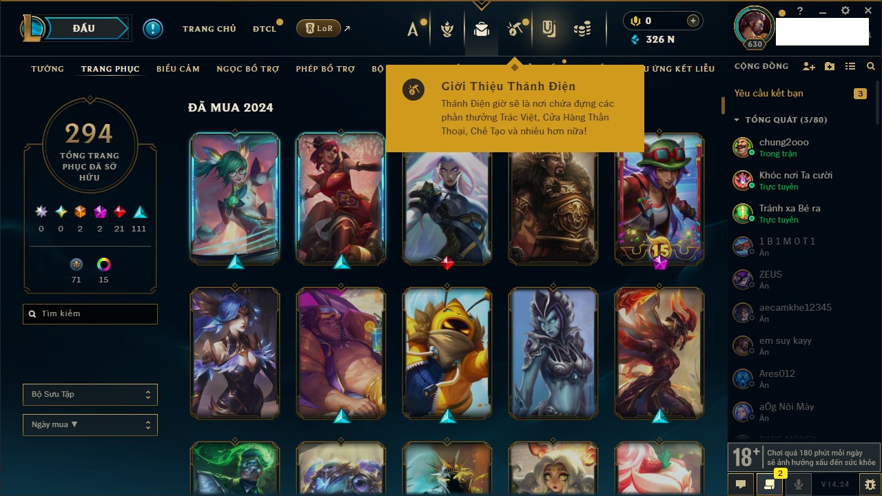 Rank Đơn: Vàng IIIKhung: VàngTướng: 171 - Còn 88128 THXTrang Phục: 329Rank ĐTCL: Chưa RankLinh Thú: 41
