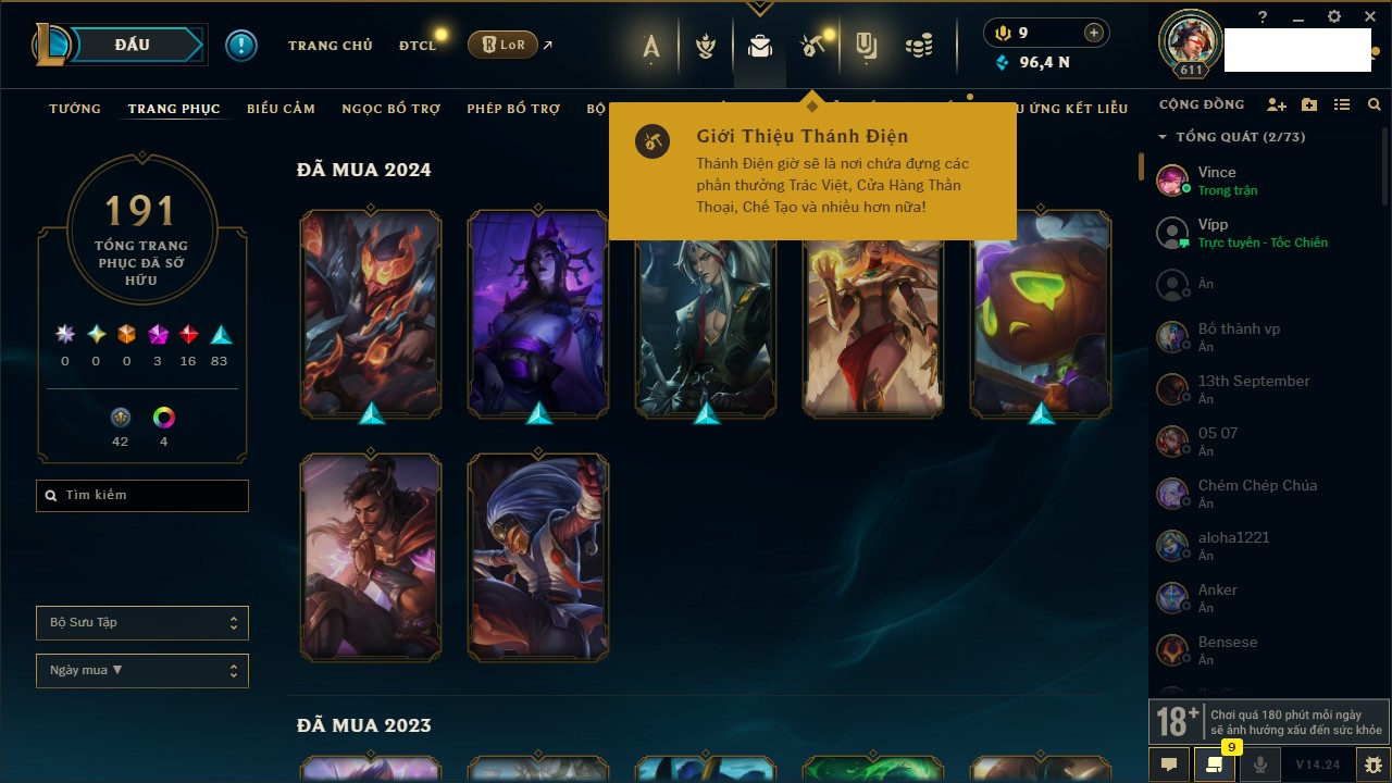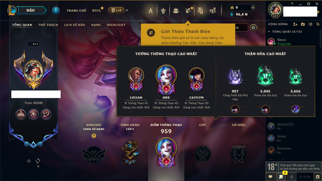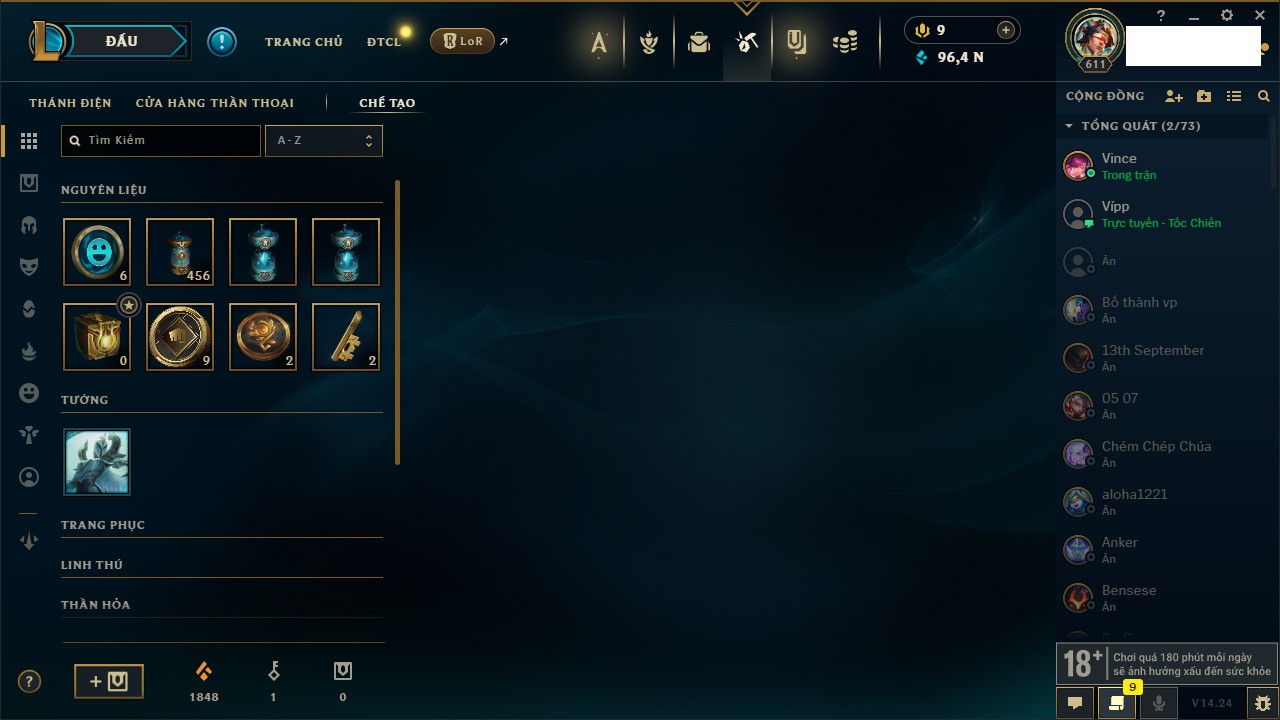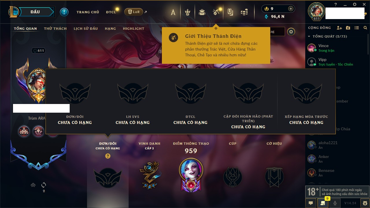 Rank Đơn: Vàng IIIKhung: BạcTướng: 171 - Còn 101359 THXTrang Phục: 88Rank ĐTCL: Kim Cương IVLinh Thú: 200