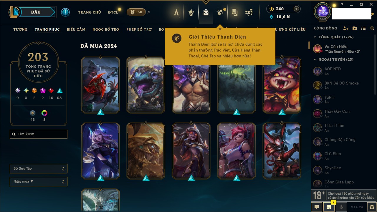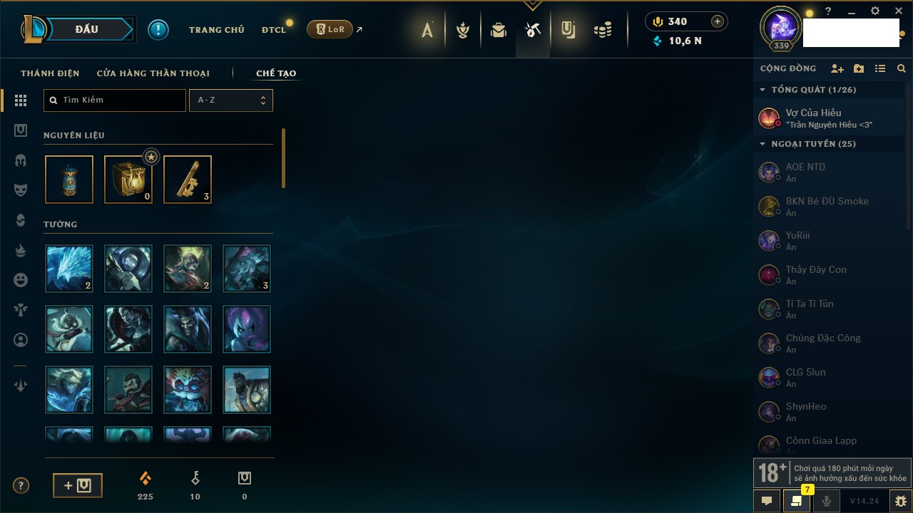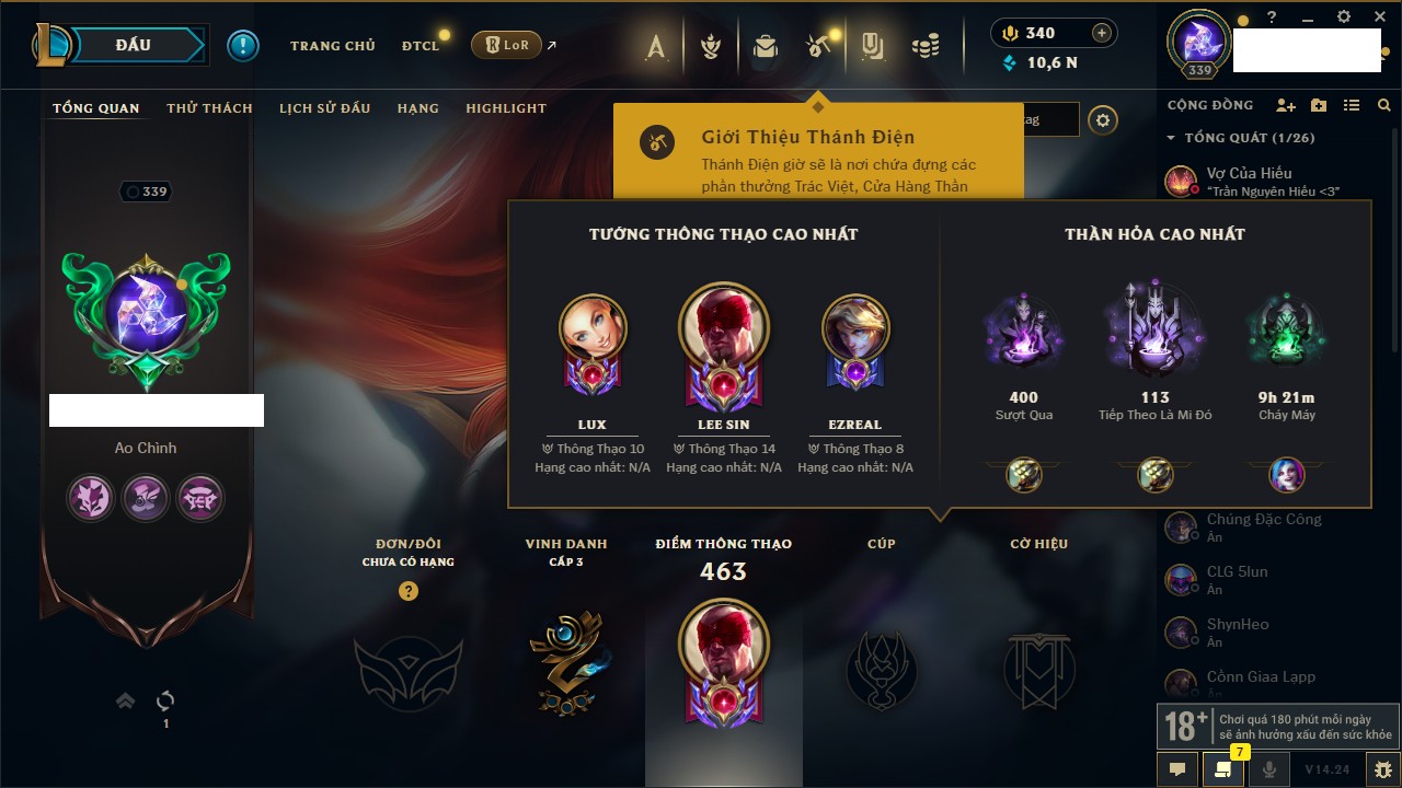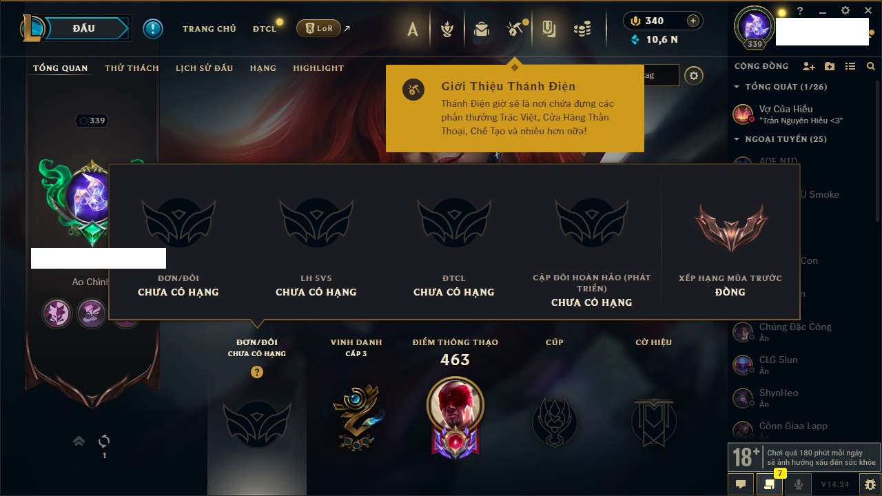 Rank Đơn: Bạc IIIKhung: BạcTướng: 171 - Còn 51045 THXTrang Phục: 220Rank ĐTCL: Sắt IILinh Thú: 141