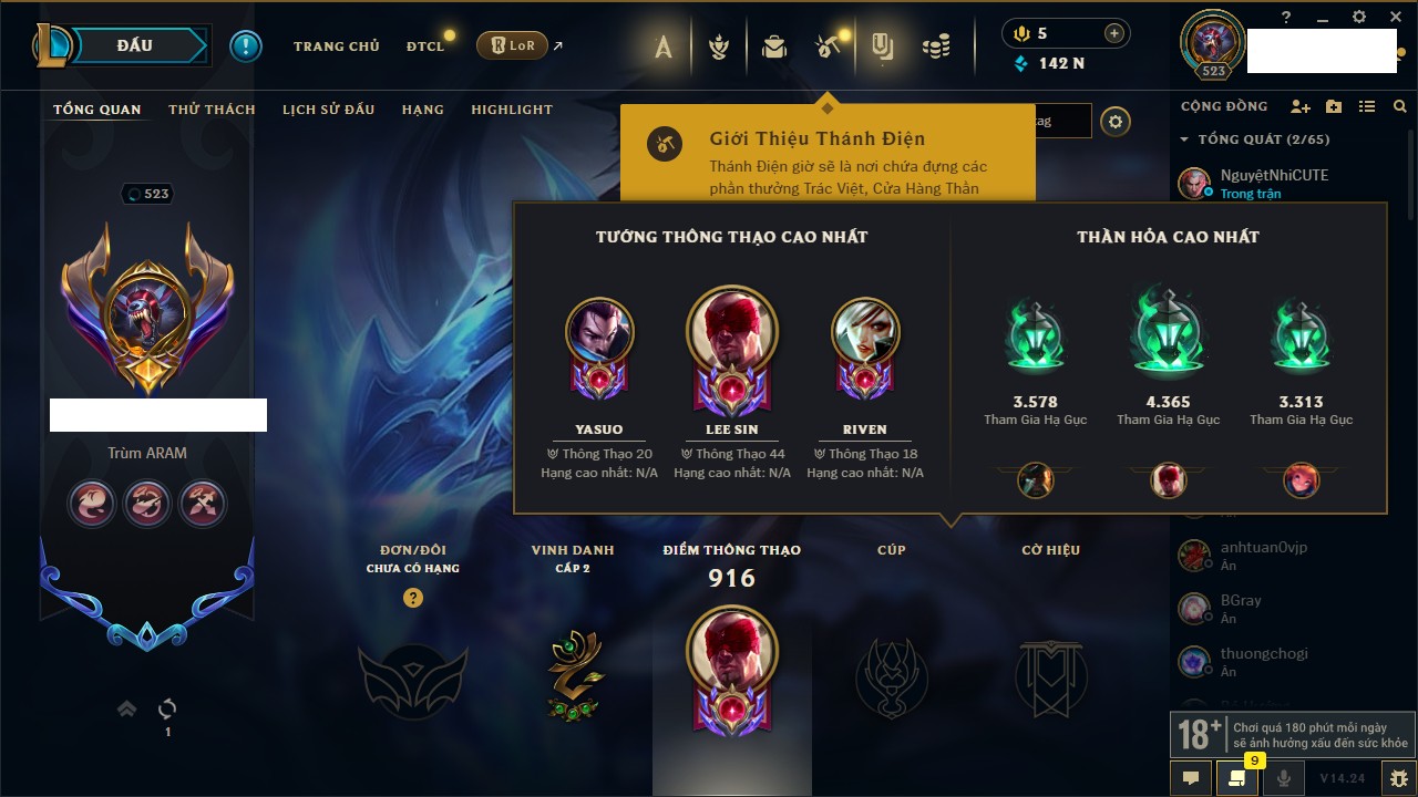 Rank Đơn: Đồng IVKhung: Chưa có khungTướng: 162 - Còn 32315 THXTrang Phục: 275Rank ĐTCL: Chưa RankLinh Thú: 33