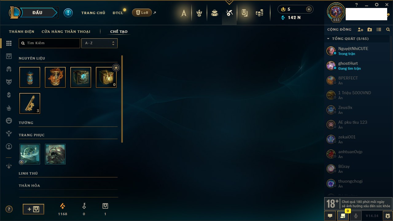 Rank Đơn: Bạc IIIKhung: BạcTướng: 170 - Còn 76760 THXTrang Phục: 235Rank ĐTCL: Chưa RankLinh Thú: 183