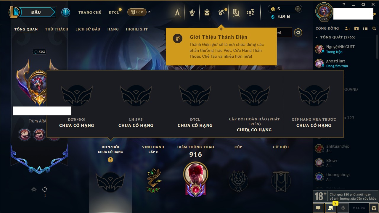 Rank Đơn: Vàng IVKhung: VàngTướng: 171 - Còn 135001 THXTrang Phục: 195Rank ĐTCL: Bạch Kim IVLinh Thú: 147