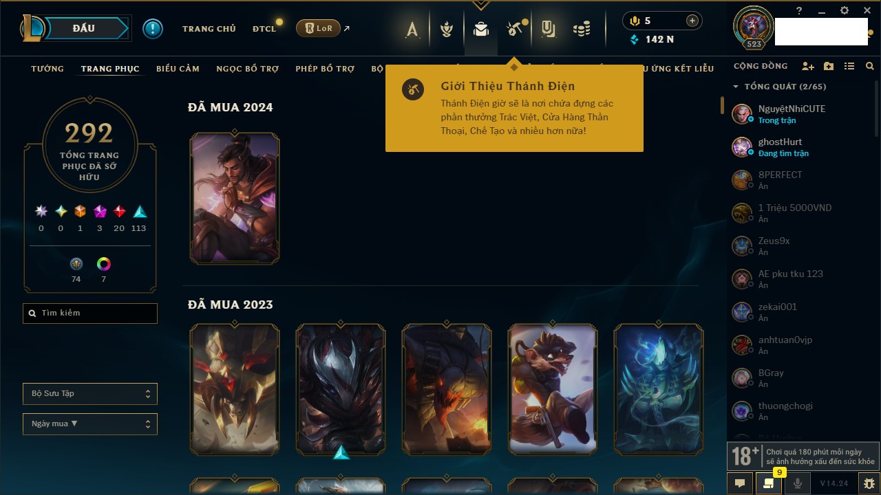 Rank Đơn: Chưa RankKhung: Chưa có khungTướng: 170 - Còn 14503 THXTrang Phục: 180Rank ĐTCL: Chưa RankLinh Thú: 131