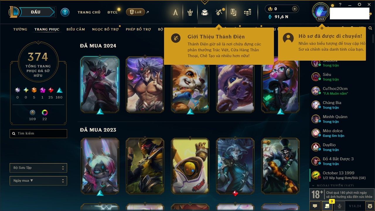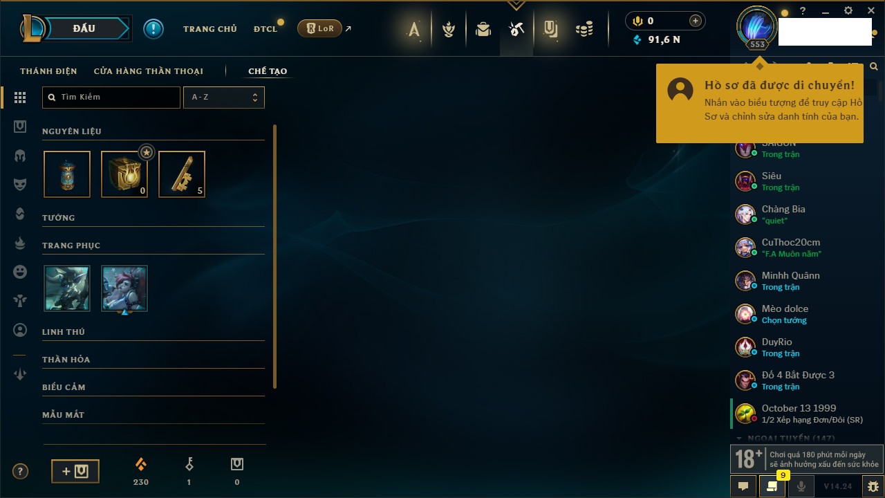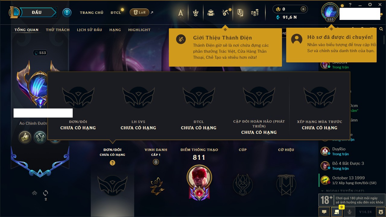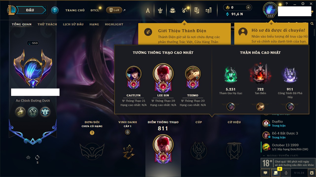 Rank Đơn: Vàng IKhung: Bạch kimTướng: 170 - Còn 212450 THXTrang Phục: 214Rank ĐTCL: Bạch Kim IVLinh Thú: 221