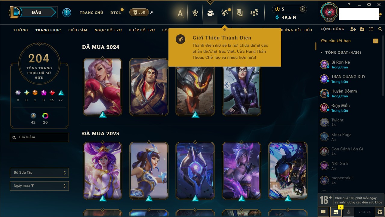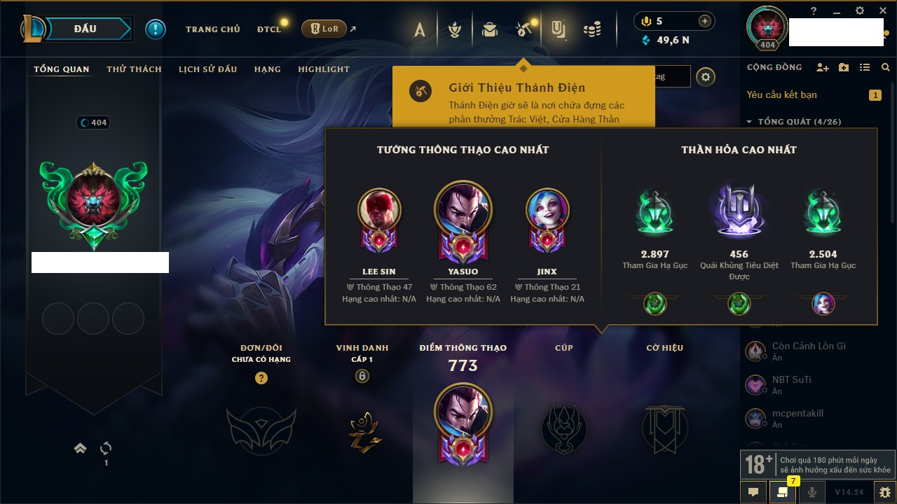 Rank Đơn: Vàng IVKhung: VàngTướng: 171 - Còn 48721 THXTrang Phục: 171Rank ĐTCL: Chưa RankLinh Thú: 27