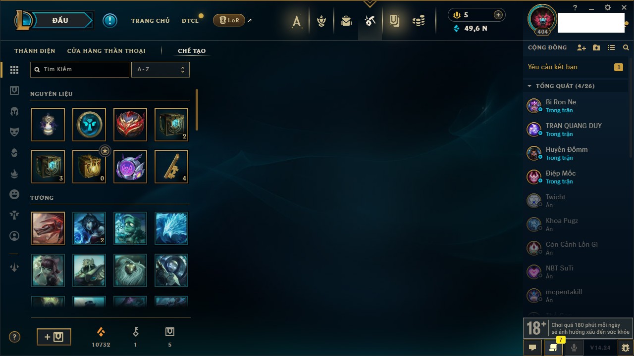 Rank Đơn: Vàng IVKhung: BạcTướng: 171 - Còn 231097 THXTrang Phục: 180Rank ĐTCL: Vàng IVLinh Thú: 110
