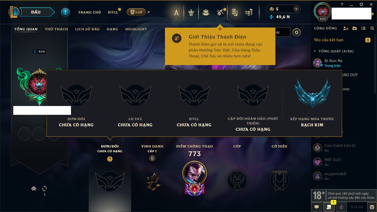 Rank Đơn: Bạc IIKhung: VàngTướng: 171 - Còn 332462 THXTrang Phục: 165Rank ĐTCL: Kim Cương IVLinh Thú: 181