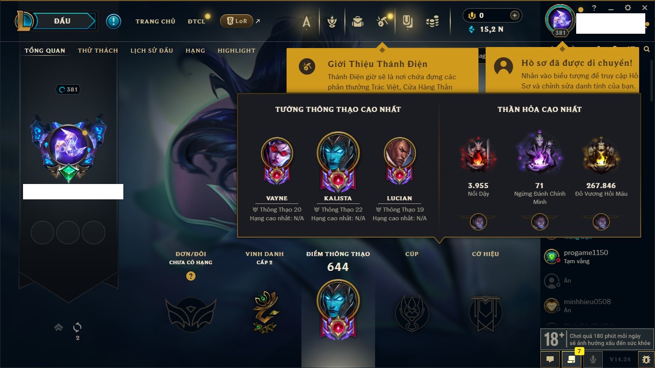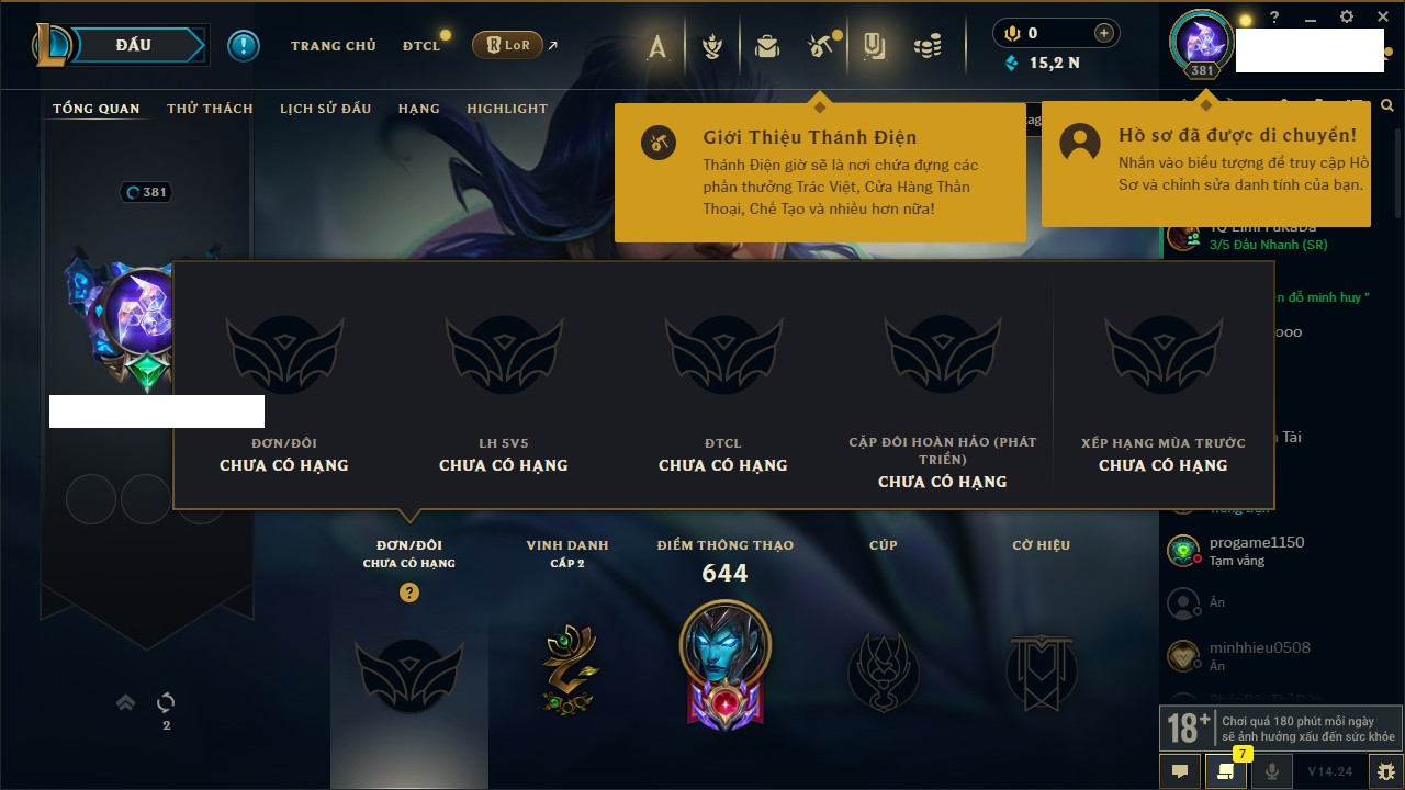 Rank Đơn: Bạc IIKhung: VàngTướng: 171 - Còn 332462 THXTrang Phục: 165Rank ĐTCL: Kim Cương IVLinh Thú: 181
