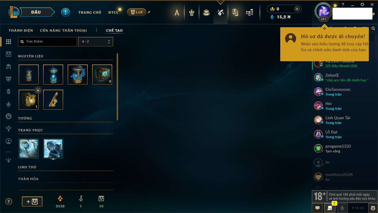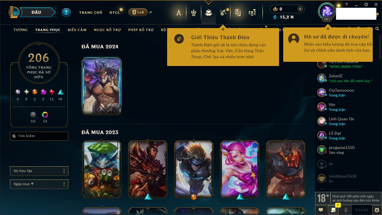 Rank Đơn: Vàng IVKhung: BạcTướng: 166 - Còn 180925 THXTrang Phục: 163Rank ĐTCL: Chưa RankLinh Thú: 67