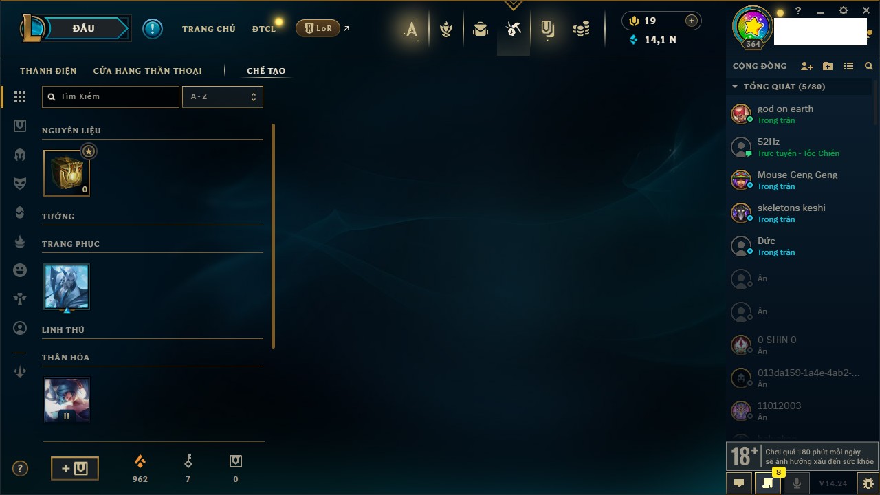 Rank Đơn: Vàng IVKhung: BạcTướng: 166 - Còn 180925 THXTrang Phục: 163Rank ĐTCL: Chưa RankLinh Thú: 67
