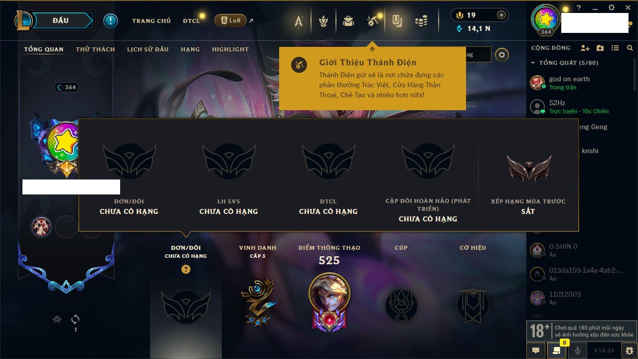 Rank Đơn: Bạc IIKhung: VàngTướng: 171 - Còn 332462 THXTrang Phục: 165Rank ĐTCL: Kim Cương IVLinh Thú: 181
