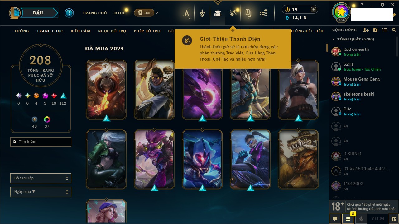 Rank Đơn: Vàng IVKhung: BạcTướng: 171 - Còn 231097 THXTrang Phục: 180Rank ĐTCL: Vàng IVLinh Thú: 110