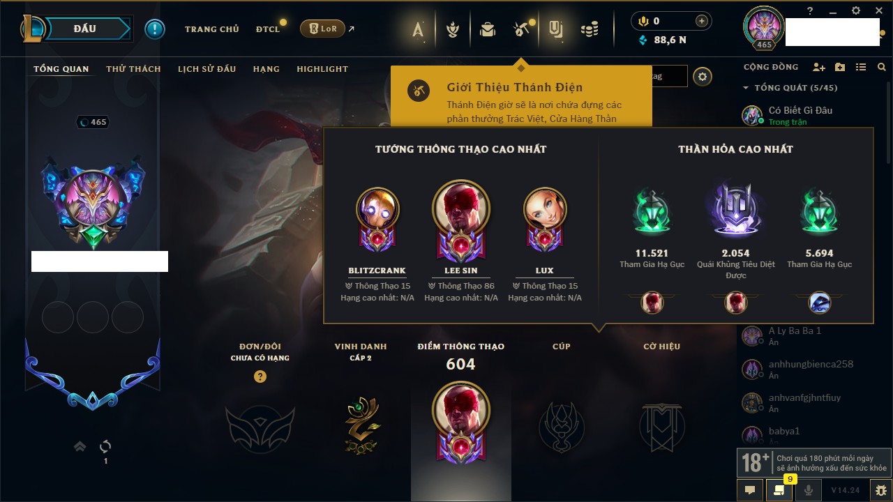 Rank Đơn: Vàng IVKhung: VàngTướng: 171 - Còn 48721 THXTrang Phục: 171Rank ĐTCL: Chưa RankLinh Thú: 27