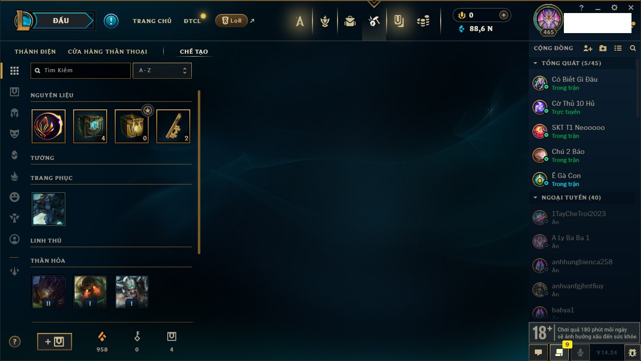 Rank Đơn: Vàng IVKhung: BạcTướng: 166 - Còn 180925 THXTrang Phục: 163Rank ĐTCL: Chưa RankLinh Thú: 67