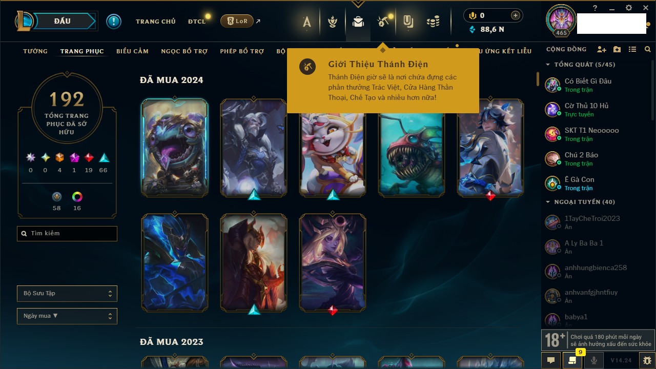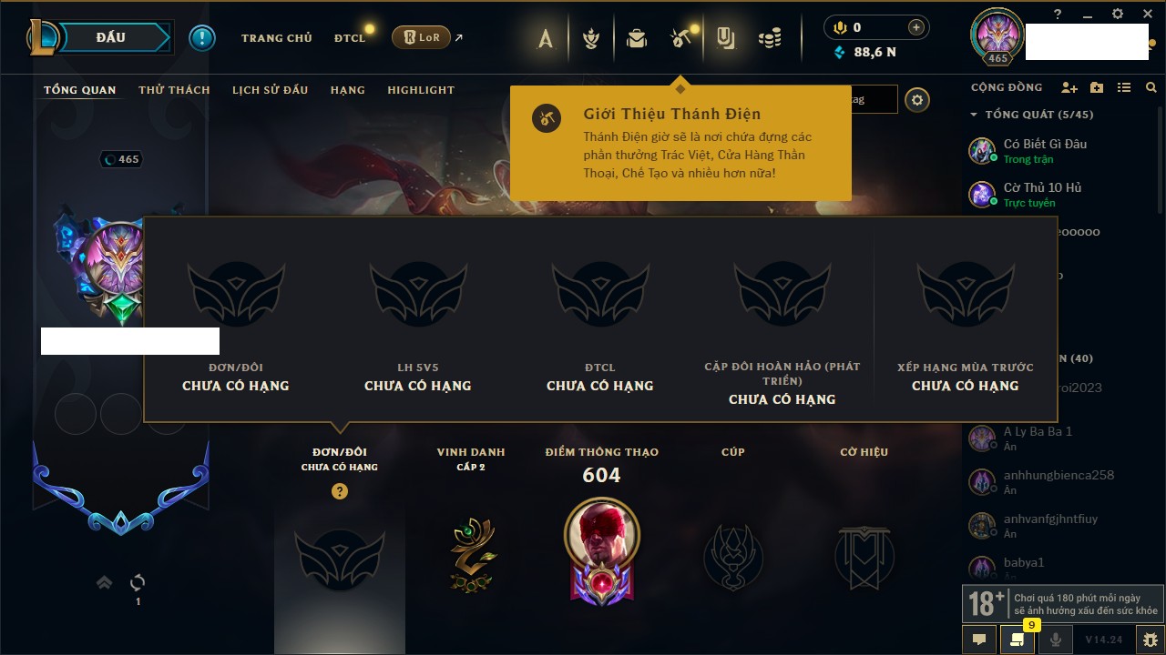 Rank Đơn: Bạc IIKhung: VàngTướng: 171 - Còn 332462 THXTrang Phục: 165Rank ĐTCL: Kim Cương IVLinh Thú: 181