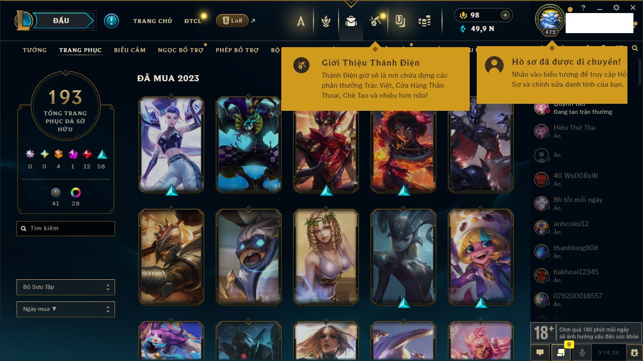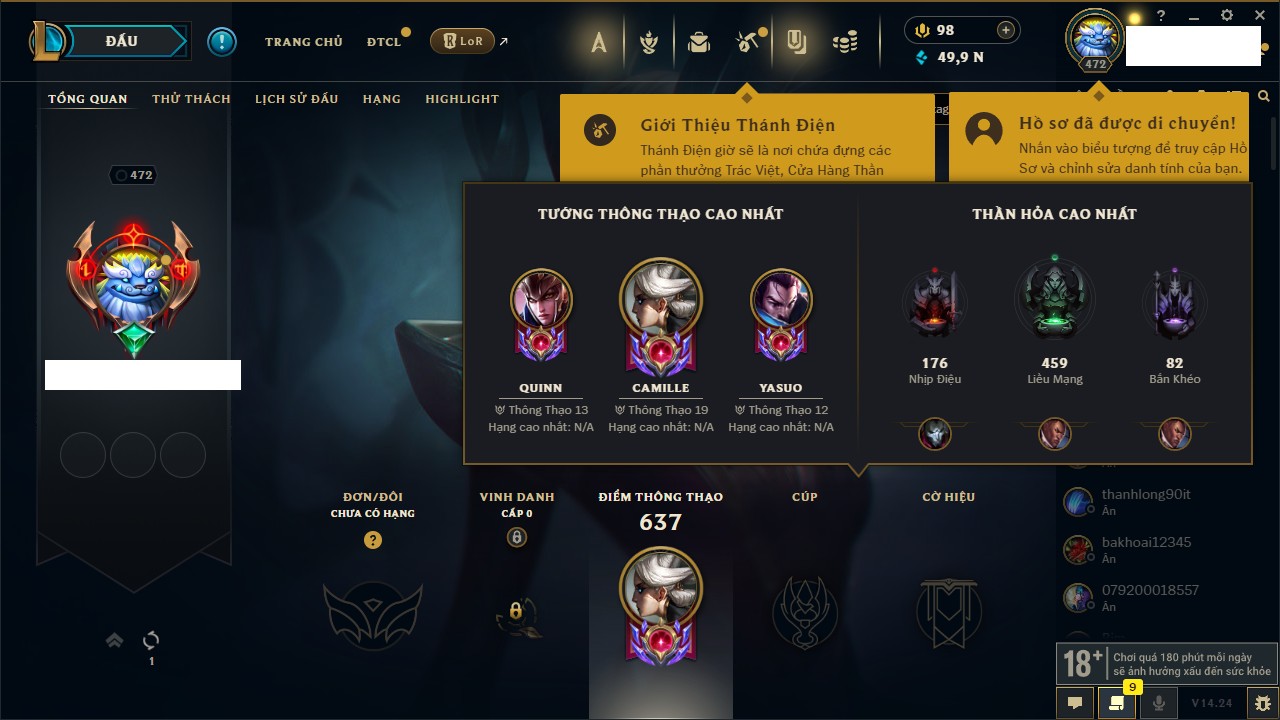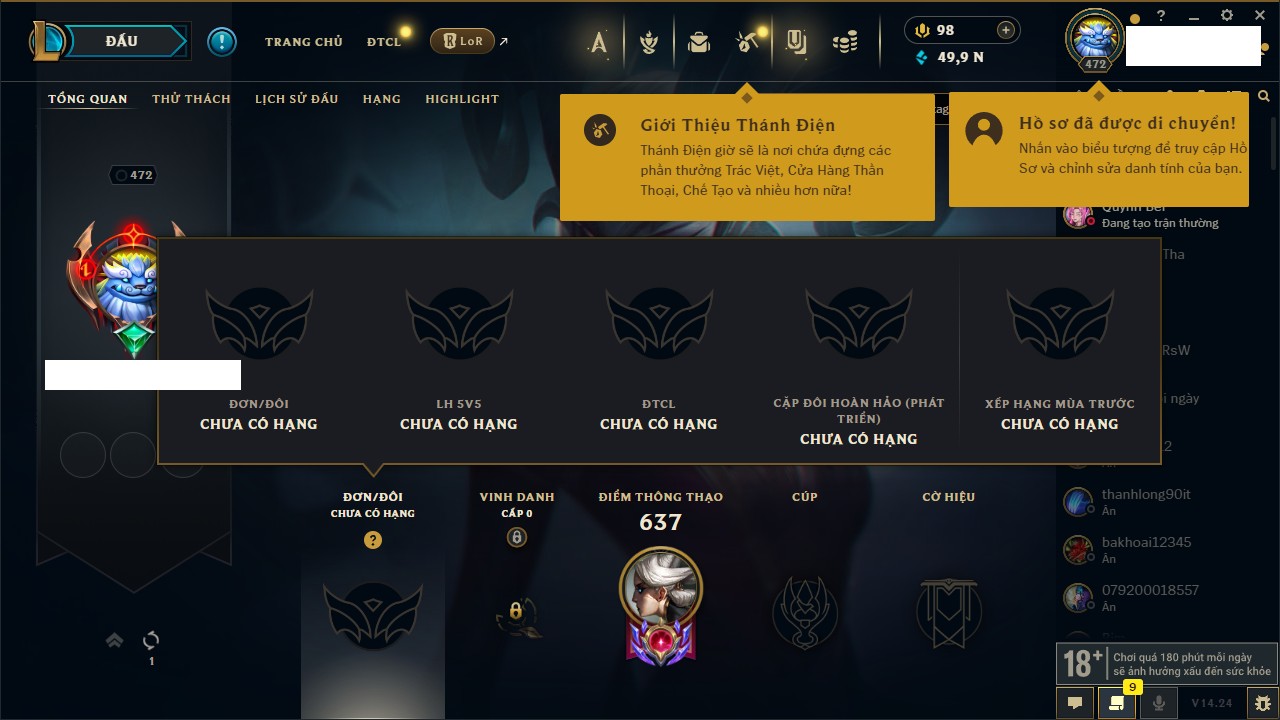 Rank Đơn: Bạc IVKhung: BạcTướng: 171 - Còn 102637 THXTrang Phục: 169Rank ĐTCL: Vàng IILinh Thú: 127