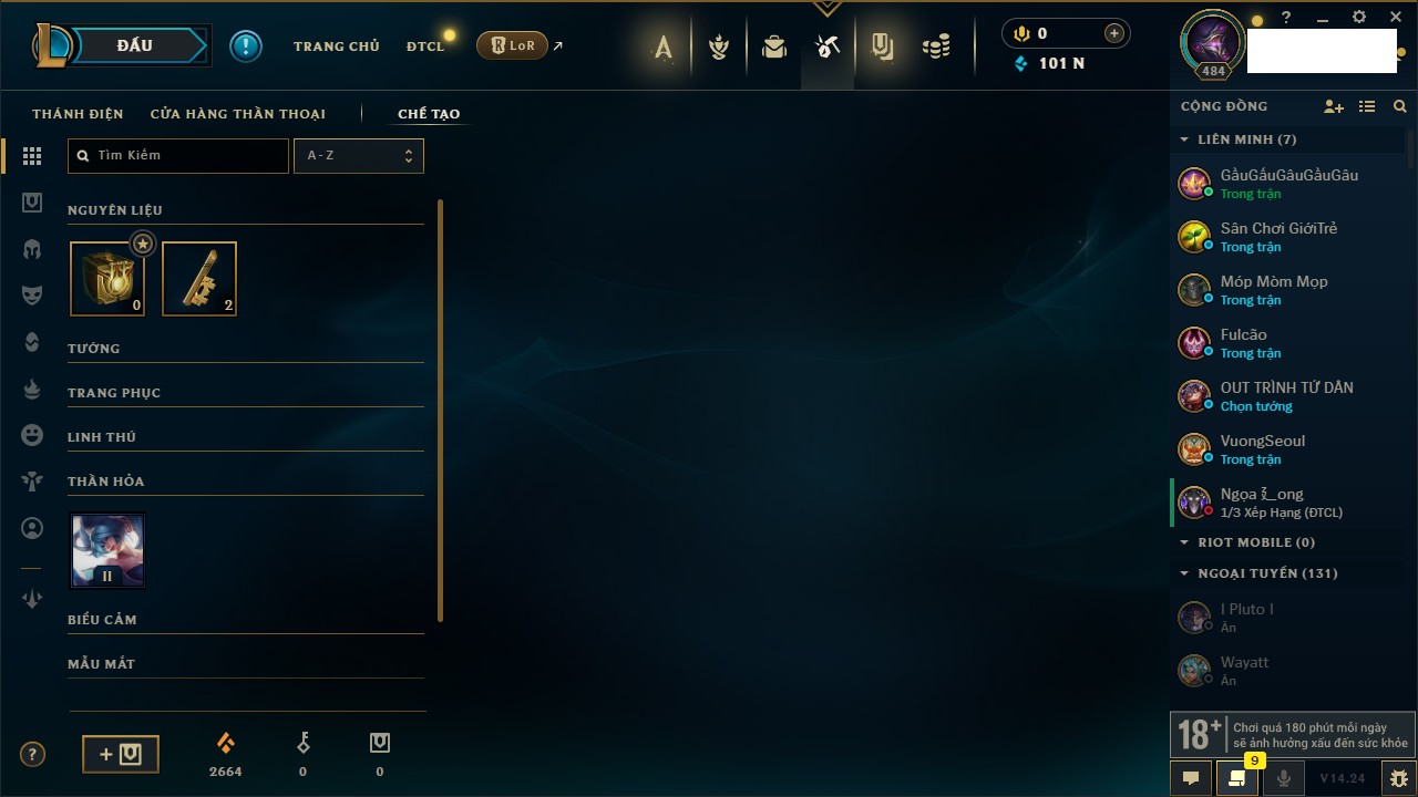 Rank Đơn: Vàng IVKhung: VàngTướng: 171 - Còn 48721 THXTrang Phục: 171Rank ĐTCL: Chưa RankLinh Thú: 27