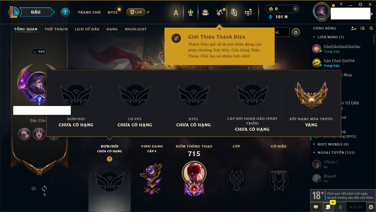 Rank Đơn: Bạc IIKhung: VàngTướng: 171 - Còn 332462 THXTrang Phục: 165Rank ĐTCL: Kim Cương IVLinh Thú: 181