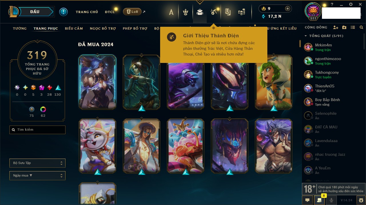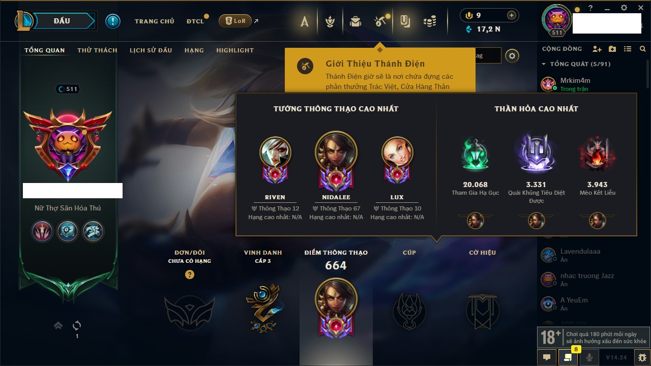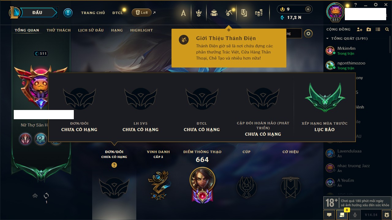 Rank Đơn: Vàng IKhung: BạcTướng: 171 - Còn 60584 THXTrang Phục: 286Rank ĐTCL: Vàng IIILinh Thú: 117