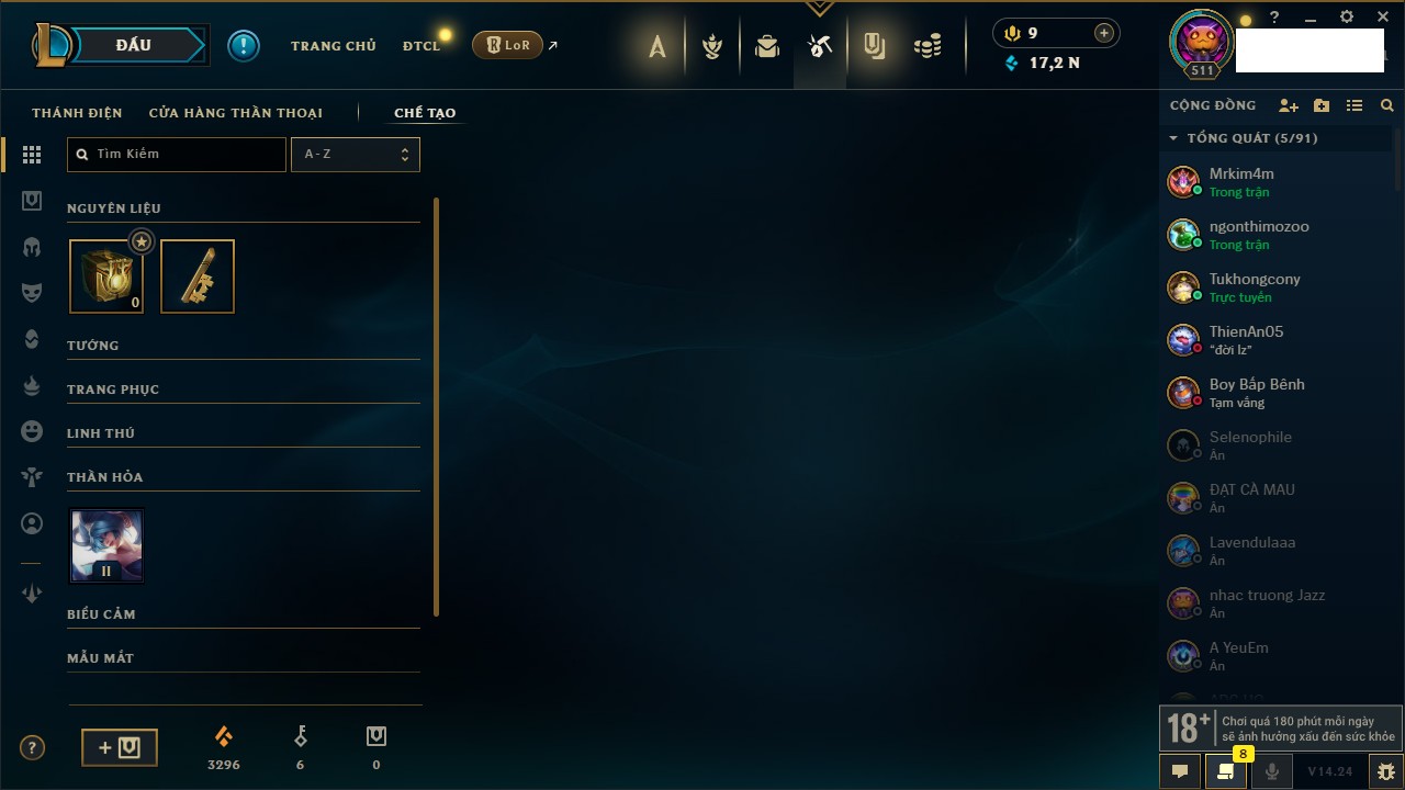 Rank Đơn: Vàng IIIKhung: VàngTướng: 171 - Còn 88128 THXTrang Phục: 329Rank ĐTCL: Chưa RankLinh Thú: 41