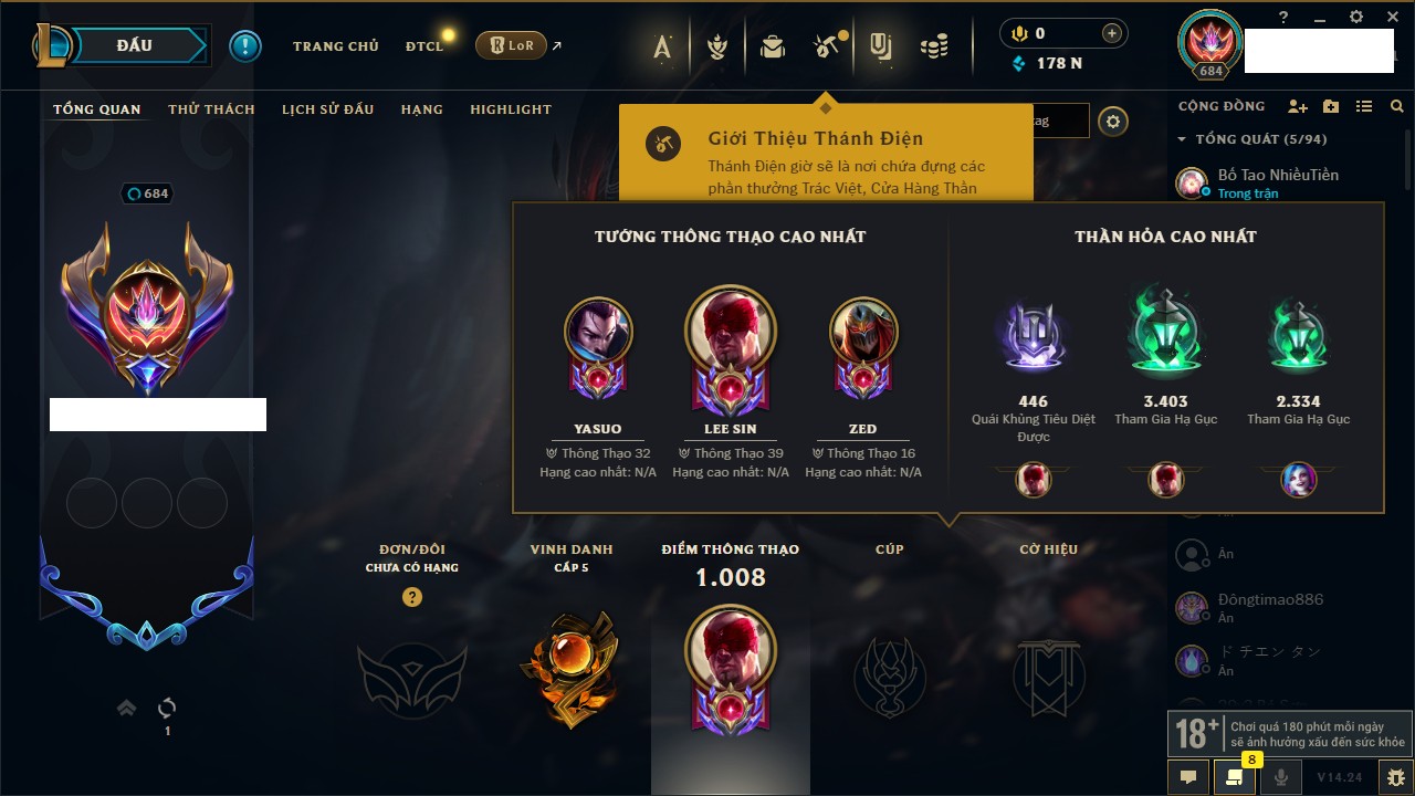 Rank Đơn: Bạc IIIKhung: Chưa có khungTướng: 171 - Còn 21493 THXTrang Phục: 252Rank ĐTCL: Bạch Kim IVLinh Thú: 123