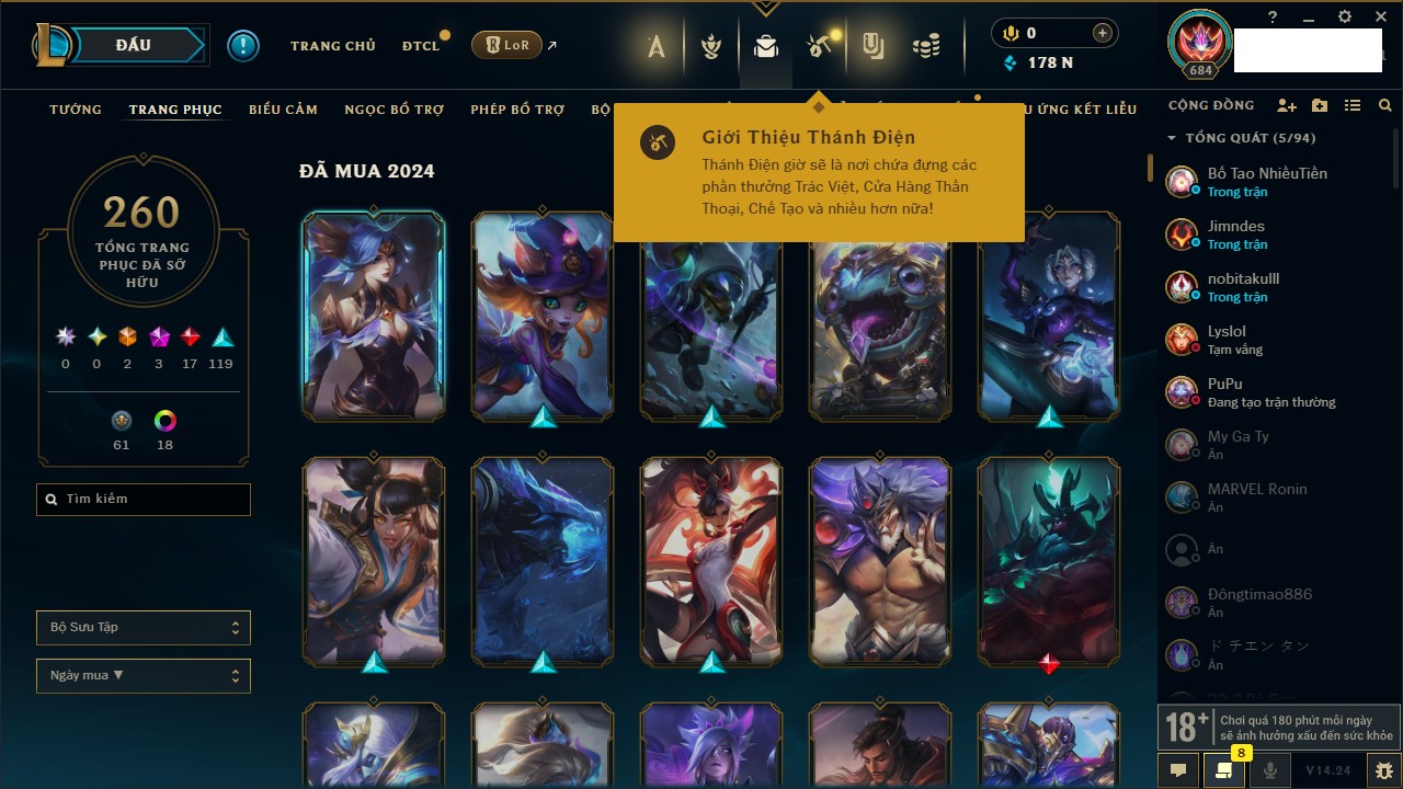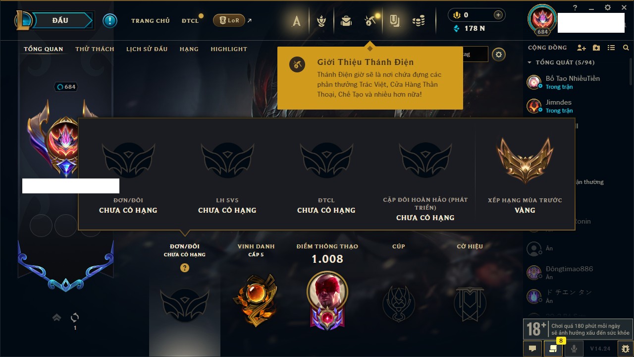 Rank Đơn: Vàng IIKhung: VàngTướng: 171 - Còn 34018 THXTrang Phục: 250Rank ĐTCL: Sắt IILinh Thú: 19