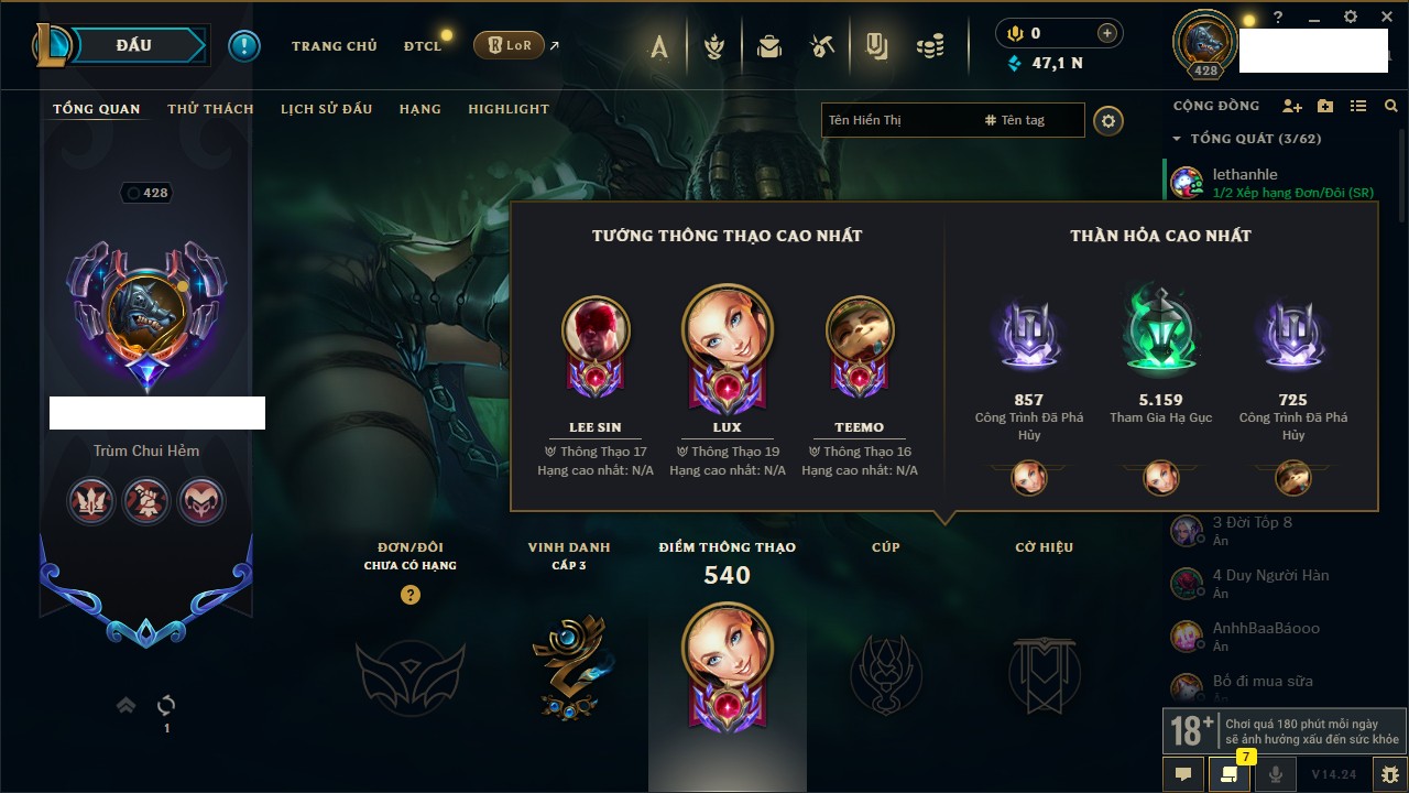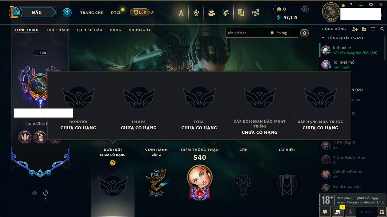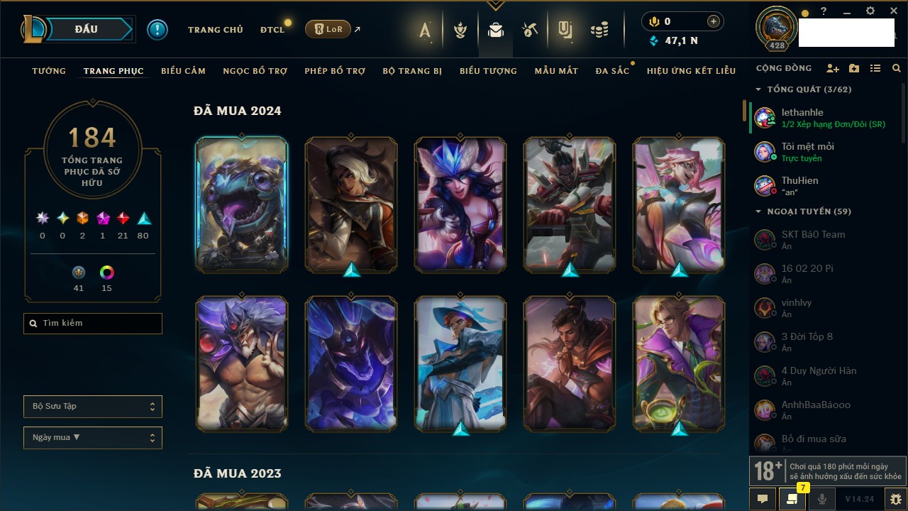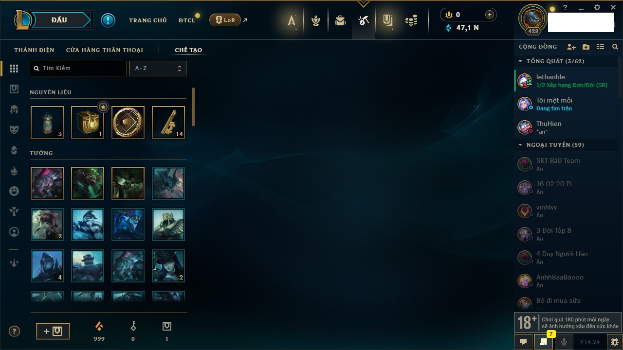 Rank Đơn: Bạc IIIKhung: BạcTướng: 168 - Còn 101710 THXTrang Phục: 184Rank ĐTCL: Chưa RankLinh Thú: 17